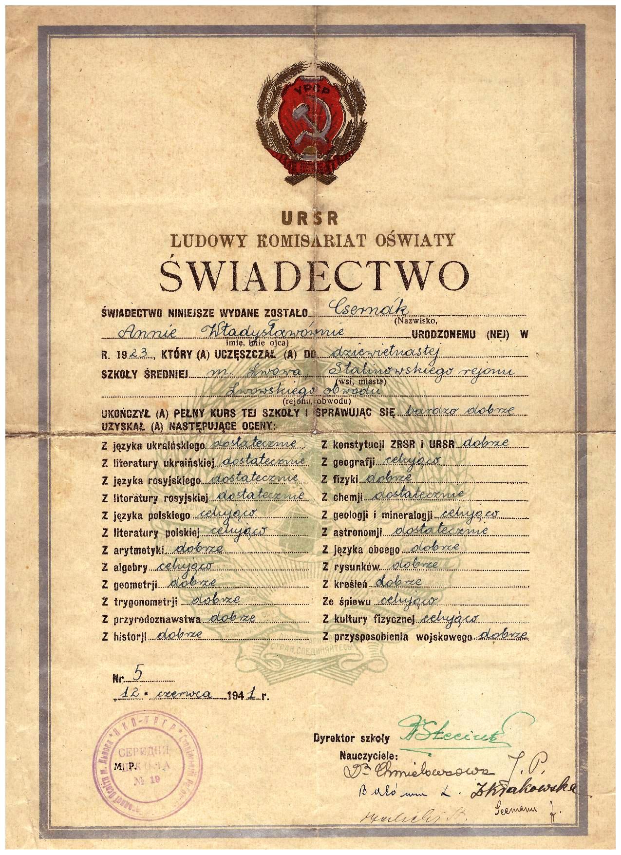 - swiadectwo-ukonczenia-szkoly-sredniej-lwow-1941-r-po-polsku-anna-csernak
