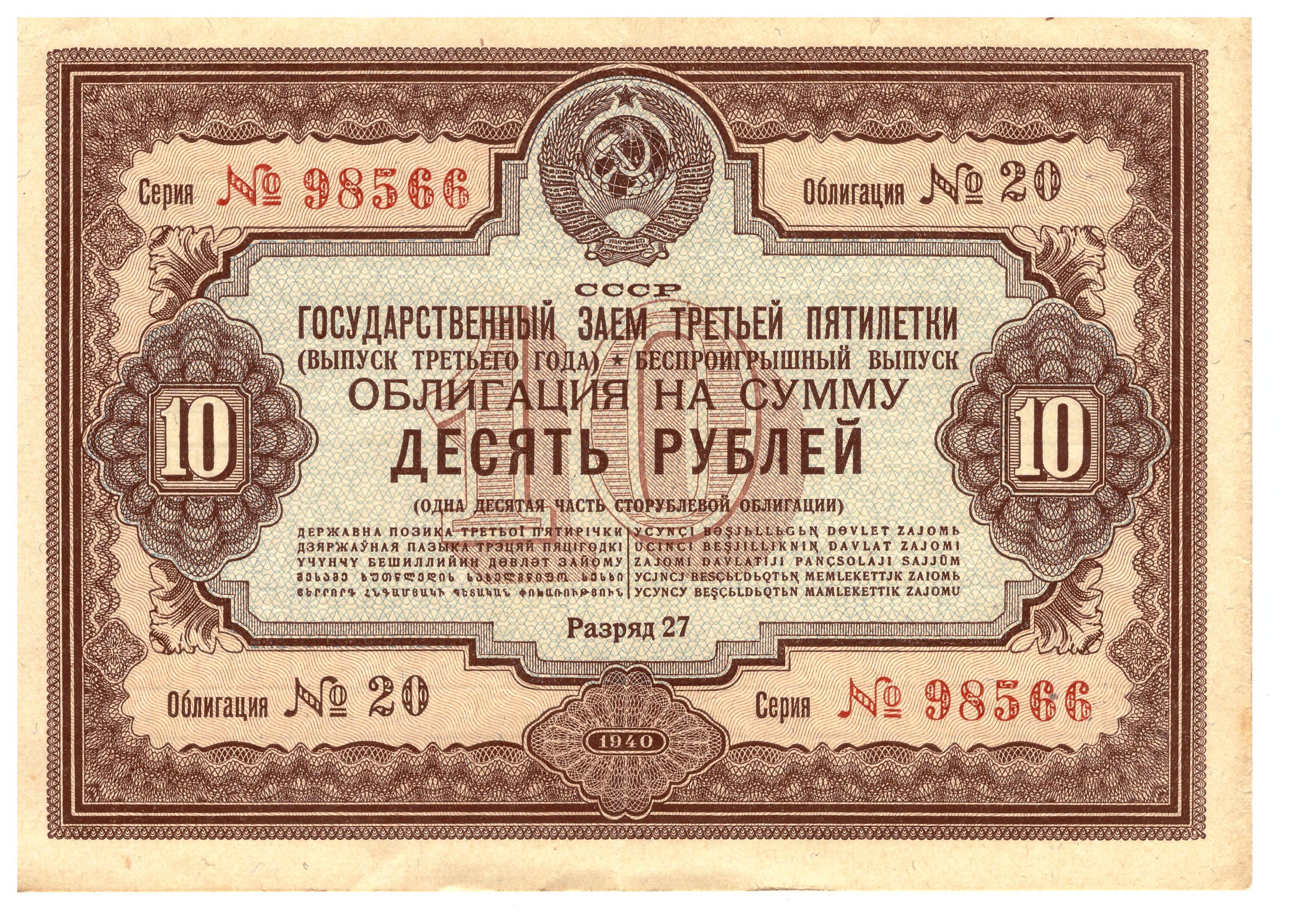 - 1940 obligacja 10 rubli awers