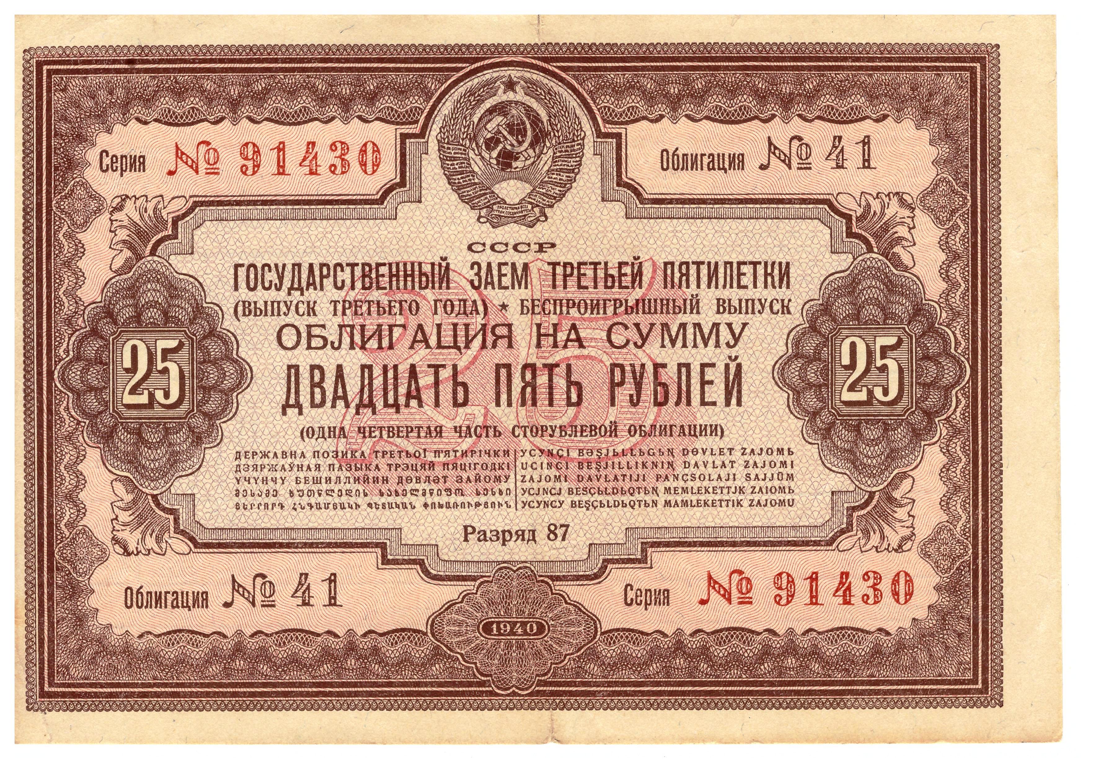- 1940 obligacja 25 rubli awers