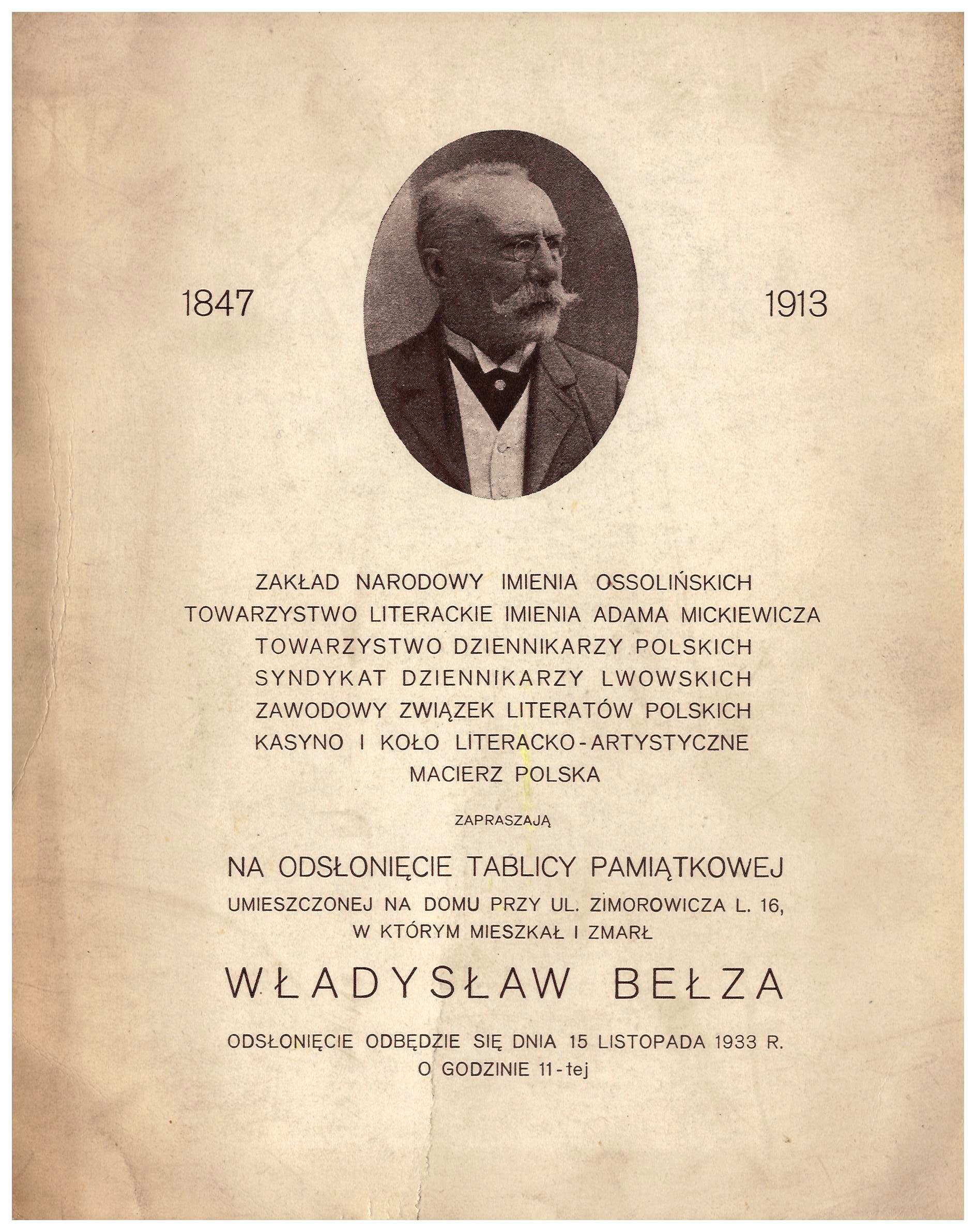 Władysław Bełza w ostatnich latach życia mieszkał niedaleko siedziby Ossolineum przy ulicy Zimorowicza (obecnie ul. Dudajewa 16), gdzie zmarł. Pochowany został w Alei Zasłużonych na miejscowym Cmentarzu Łyczakowskim.