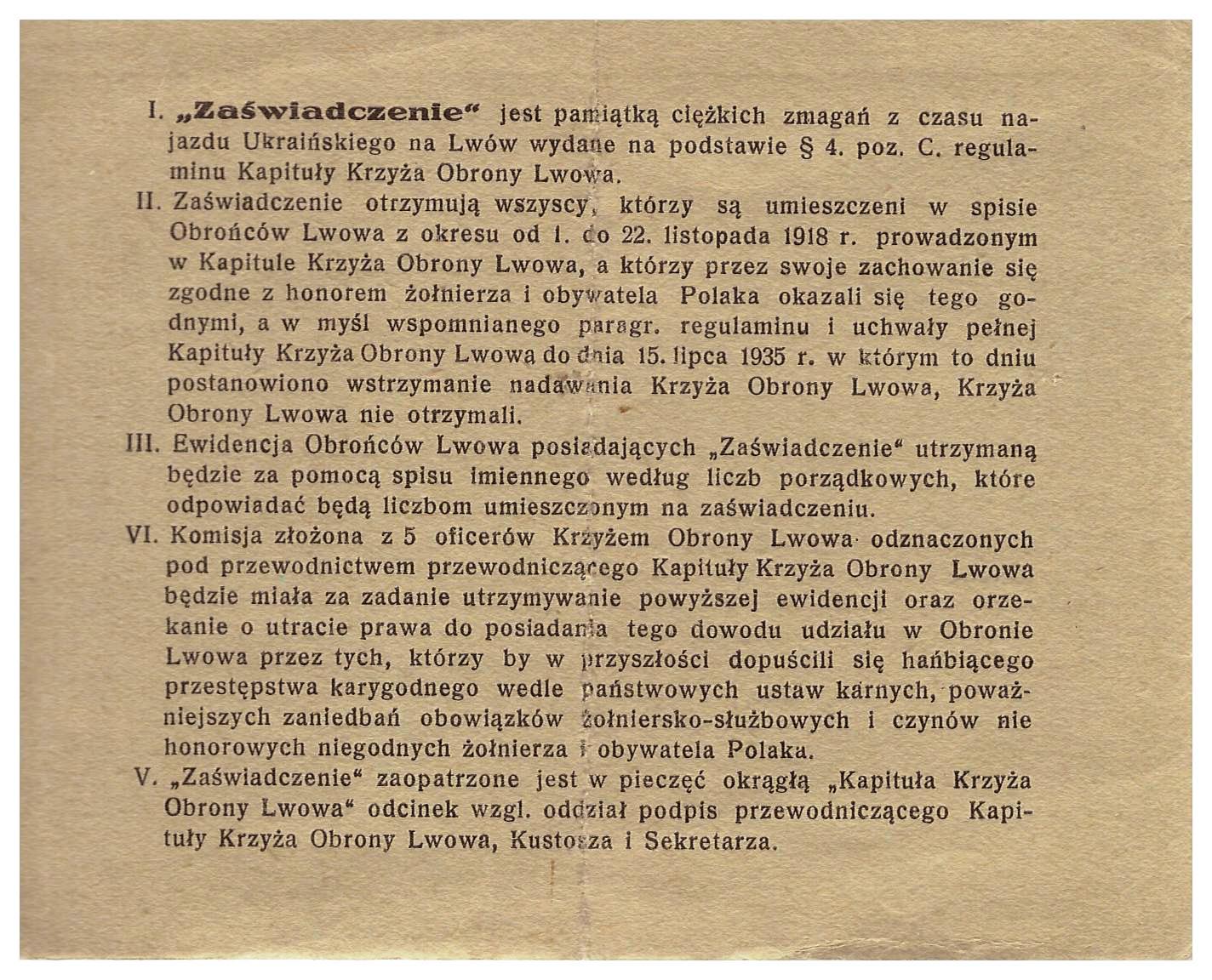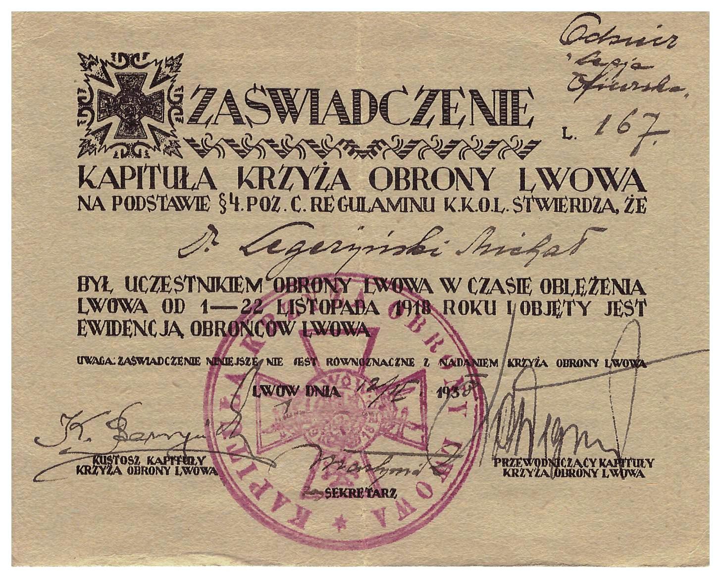 - Obrona Lwowa zaświadczenie o byciu uczestnikiem M. Legeżyński
