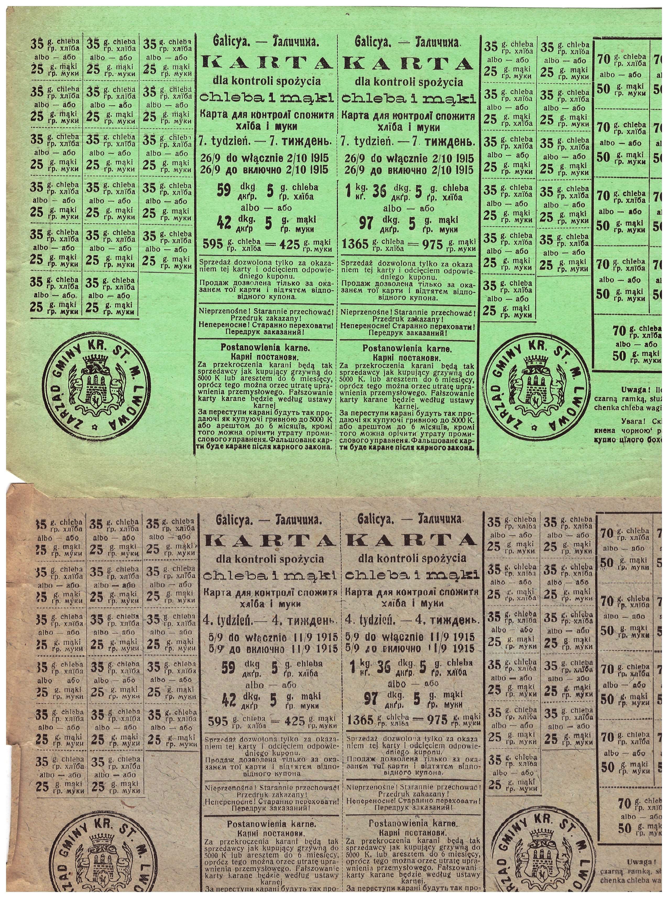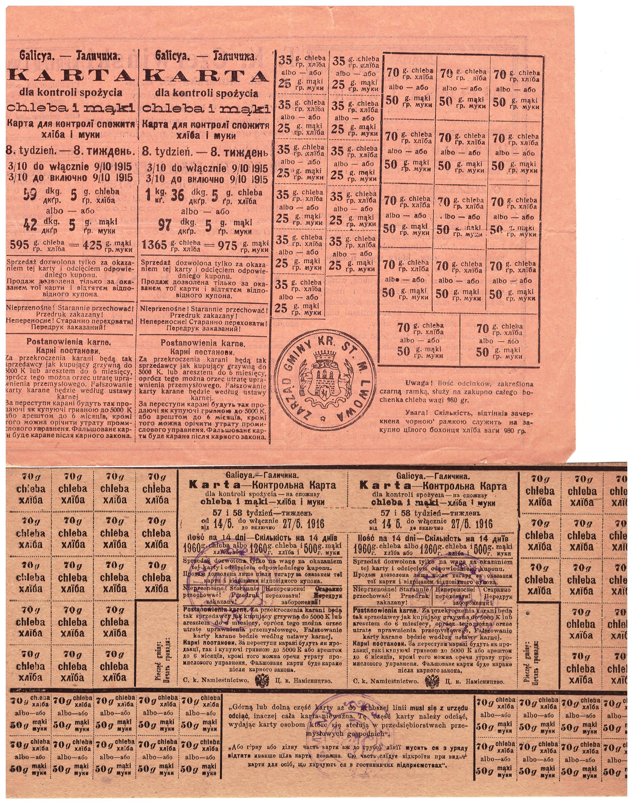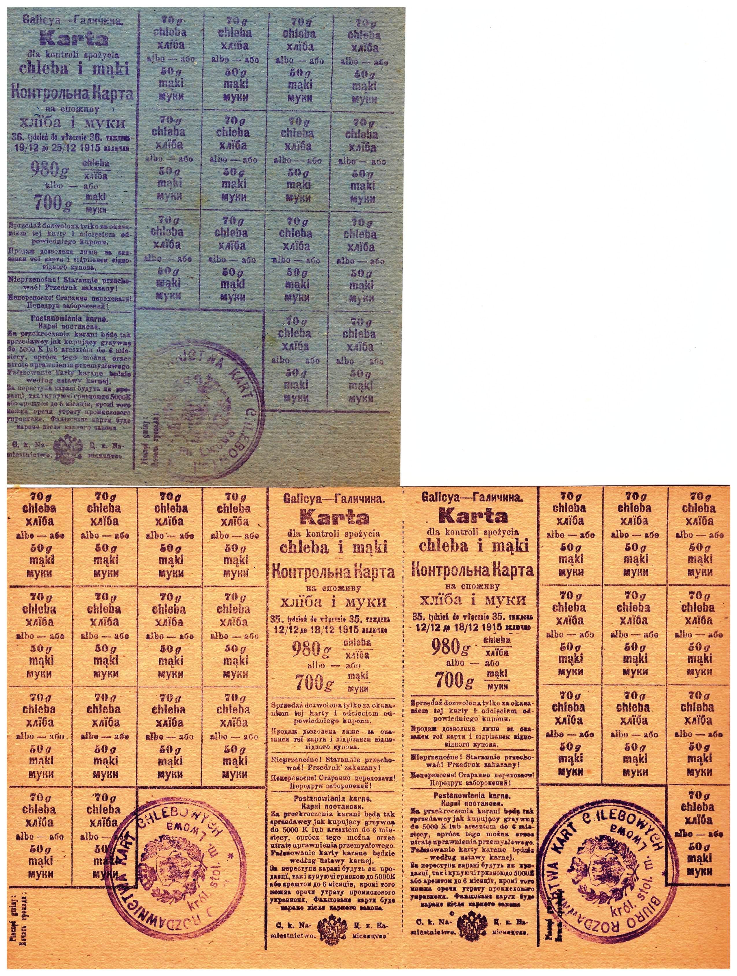 Kłopoty z zaopatrzeniem, konieczność racjonowania żywności i innych codziennych materiałów (odzież, mydło, paliwo, alkohol, buty, itp) – to smutna rzeczywistość okresów wojennych, powojennych i kryzysów gospodarczych.  Poniżej przykłady z lat: 1915-17 Lwów, 1940-41 Wilno i Kowno, 1947-85 PRL.