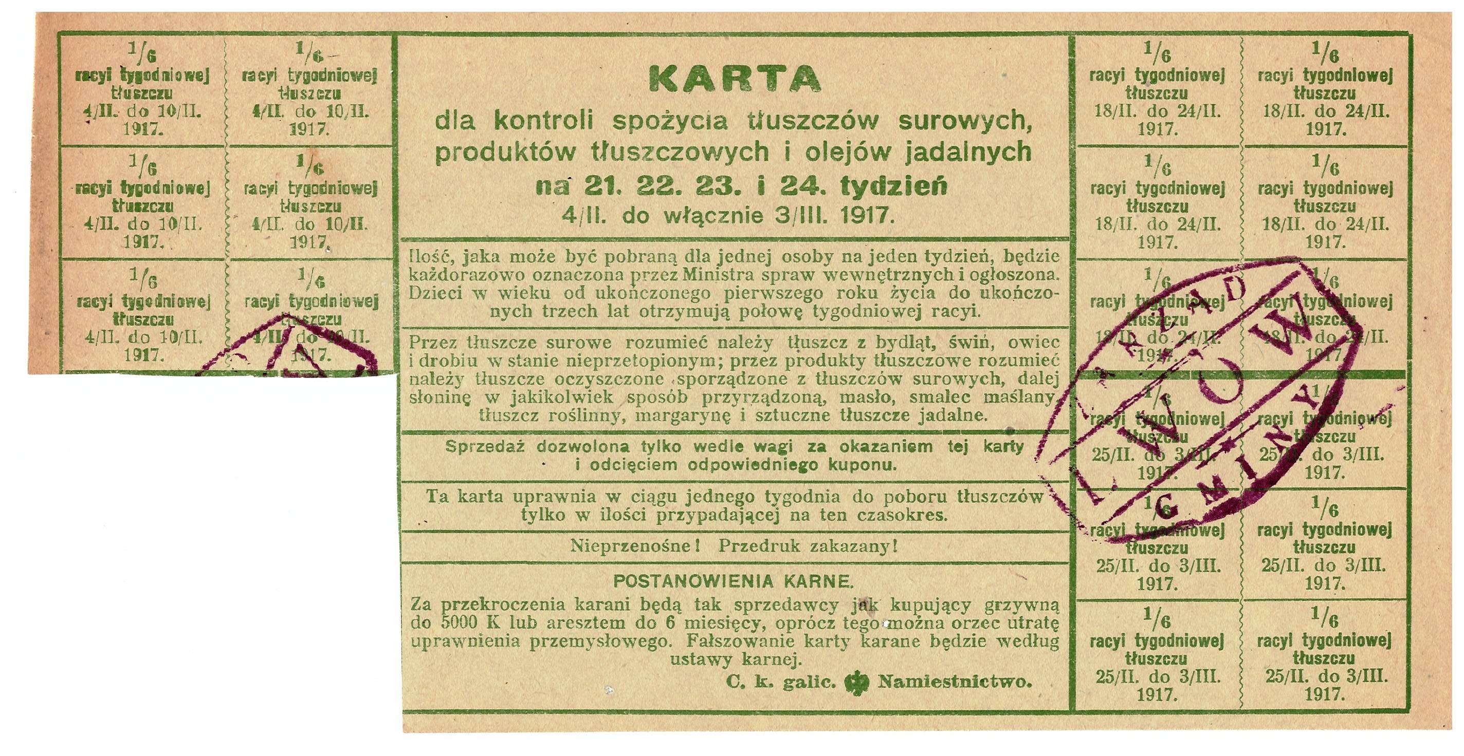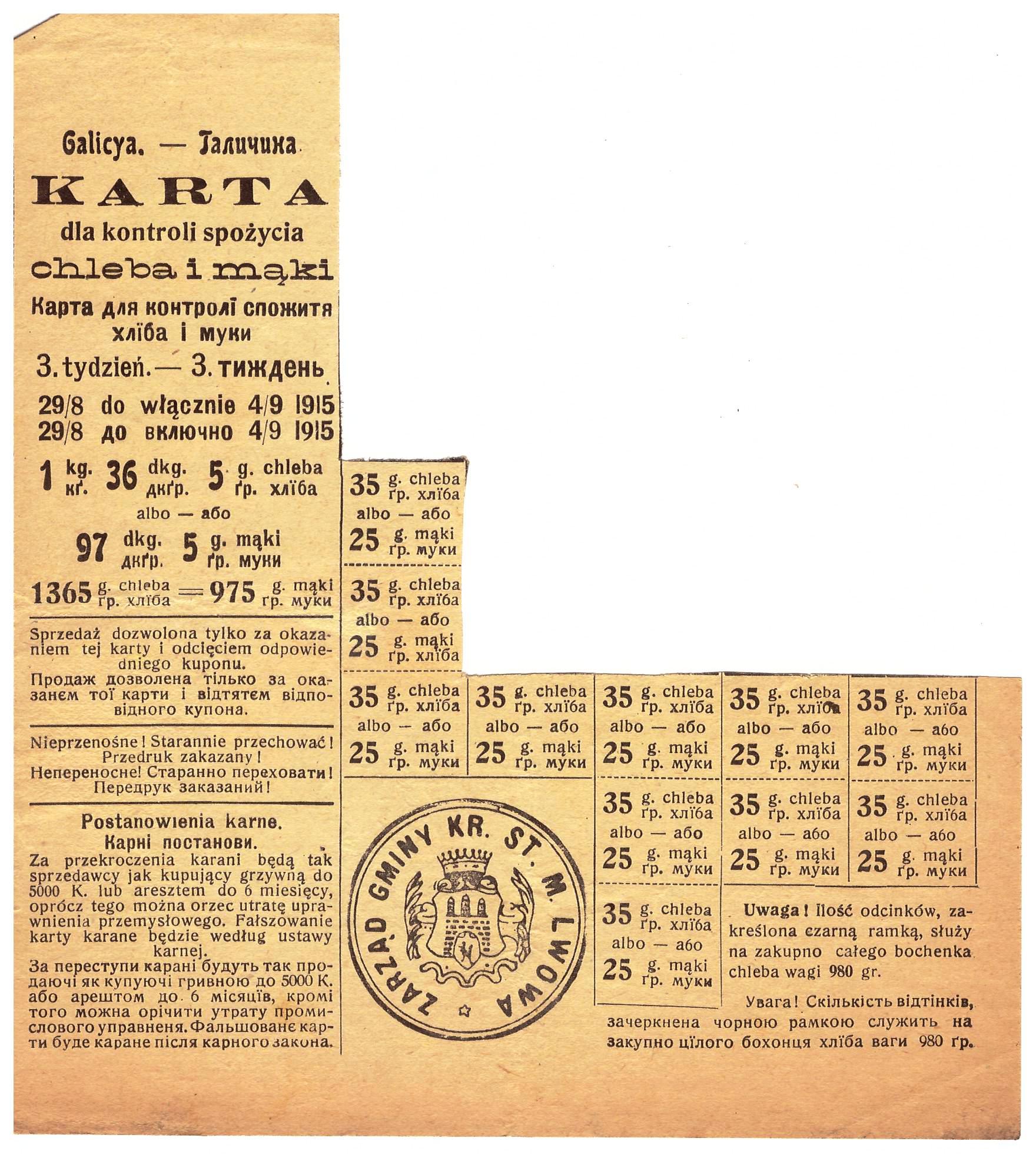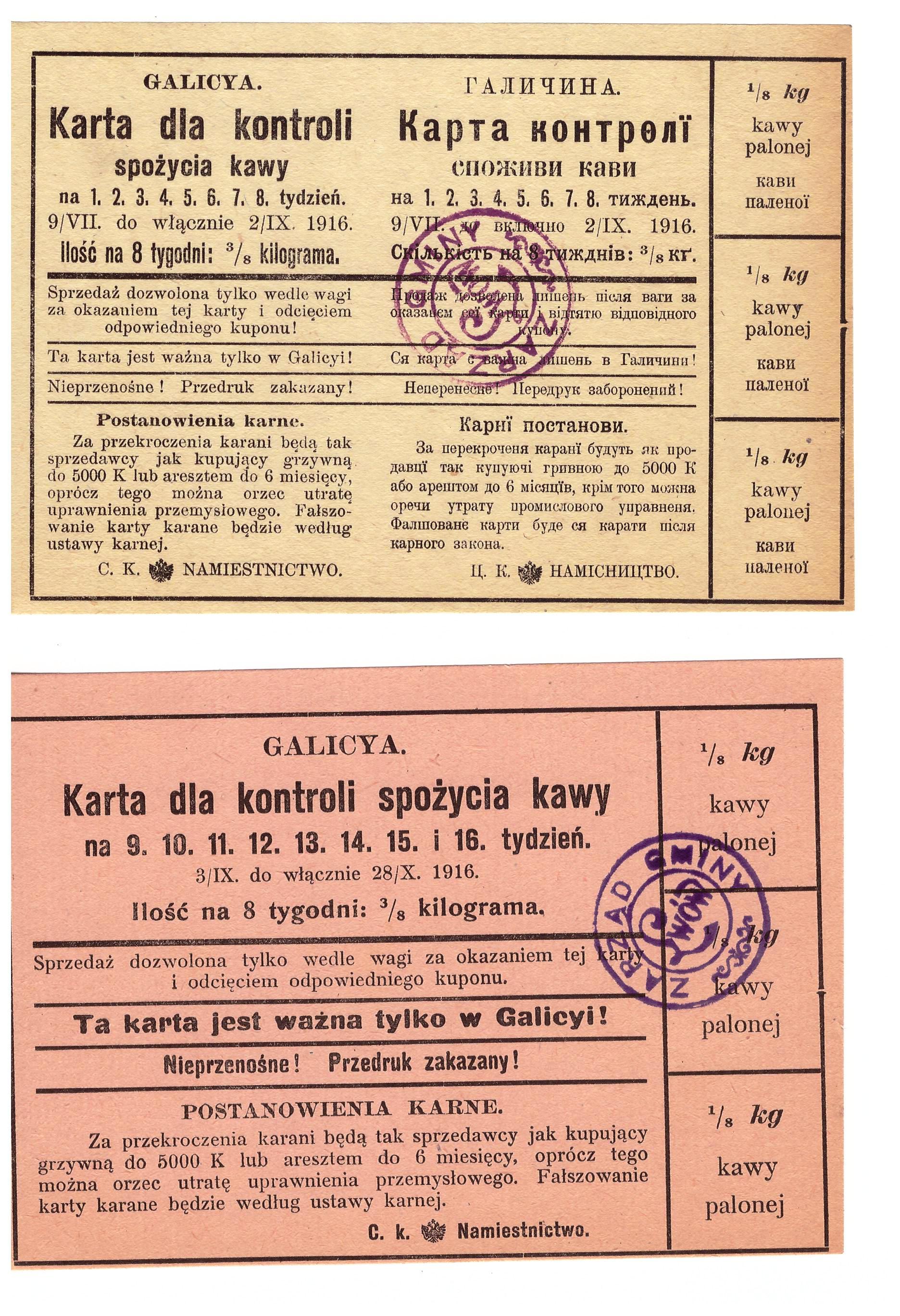 Kłopoty z zaopatrzeniem, konieczność racjonowania żywności i innych codziennych materiałów (odzież, mydło, paliwo, alkohol, buty, itp) – to smutna rzeczywistość okresów wojennych, powojennych i kryzysów gospodarczych.  Poniżej przykłady z lat: 1915-17 Lwów, 1940-41 Wilno i Kowno, 1947-85 PRL.