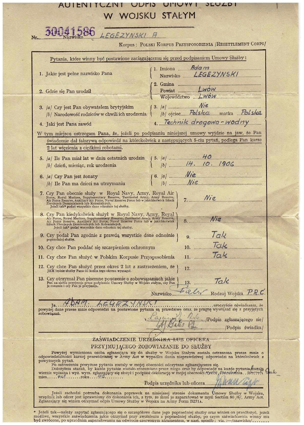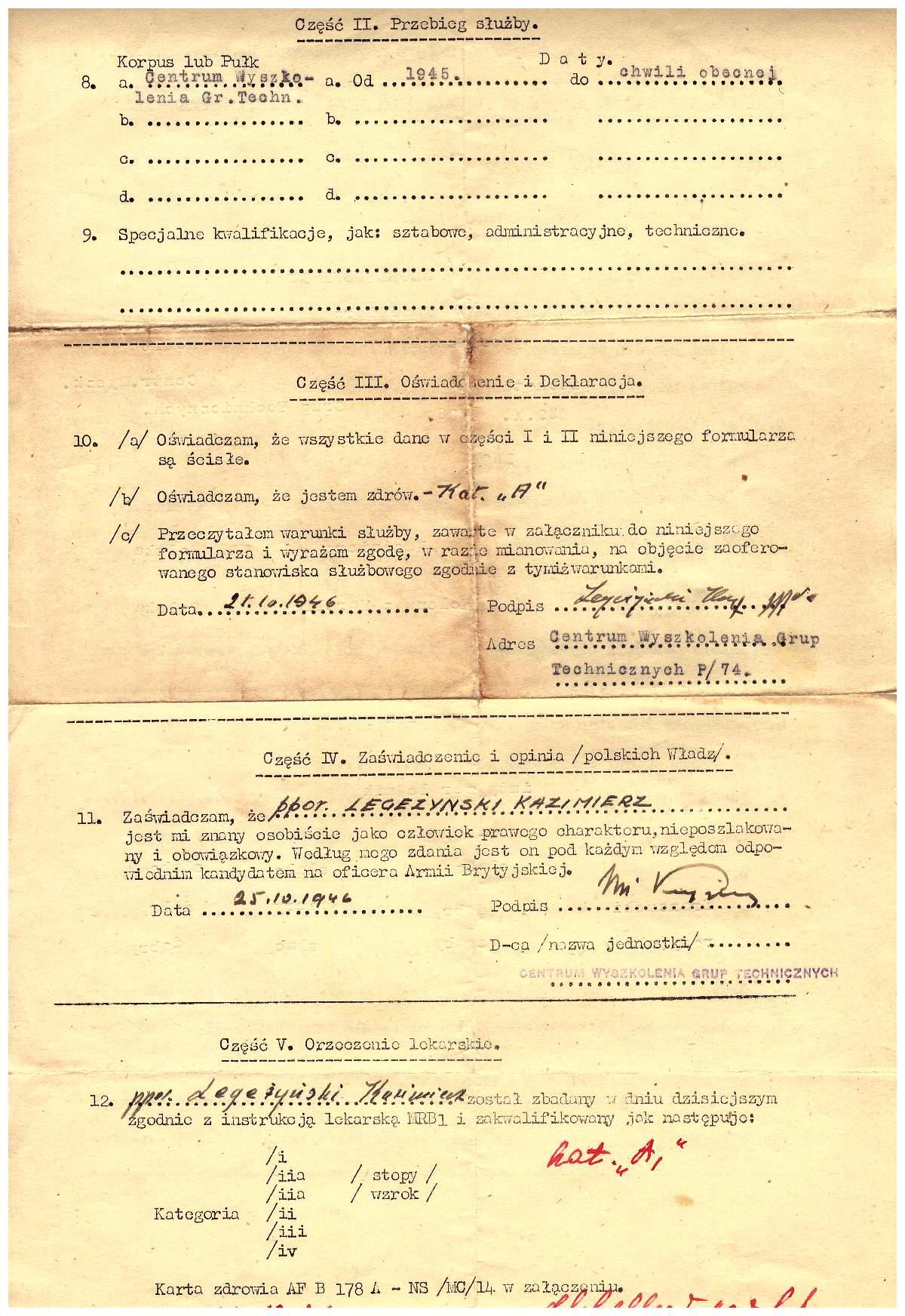 W 1939-40 r przedostał się wraz z bratem Adamem do Francji, gdzie wstąpili do Polskich Sił Zbrojnych. W 1940 r, w trakcie agresji niemieckiej na Francję, dostali się do niewoli niemieckiej i resztę wojny spędzili jako więźniowie Stalagu VII A. Kazimierz ukrył swój stopień oficerski i trafił do Stalagu, aby pozostać razem z bratem Adamem, podoficerem. Po wyzwoleniu obozu w 1945 r powrócili do PSZ i trafili do Anglii. Licznie zachowane dokumenty z 1945-48 r, dobrze ilustrują kolejne etapy kontaktu z różnymi strukturami organizacyjnymi w ramach PSZ w Anglii, poprzedzające nieuchronną demobilizację i konieczność wyboru dalszej drogi życiowej.