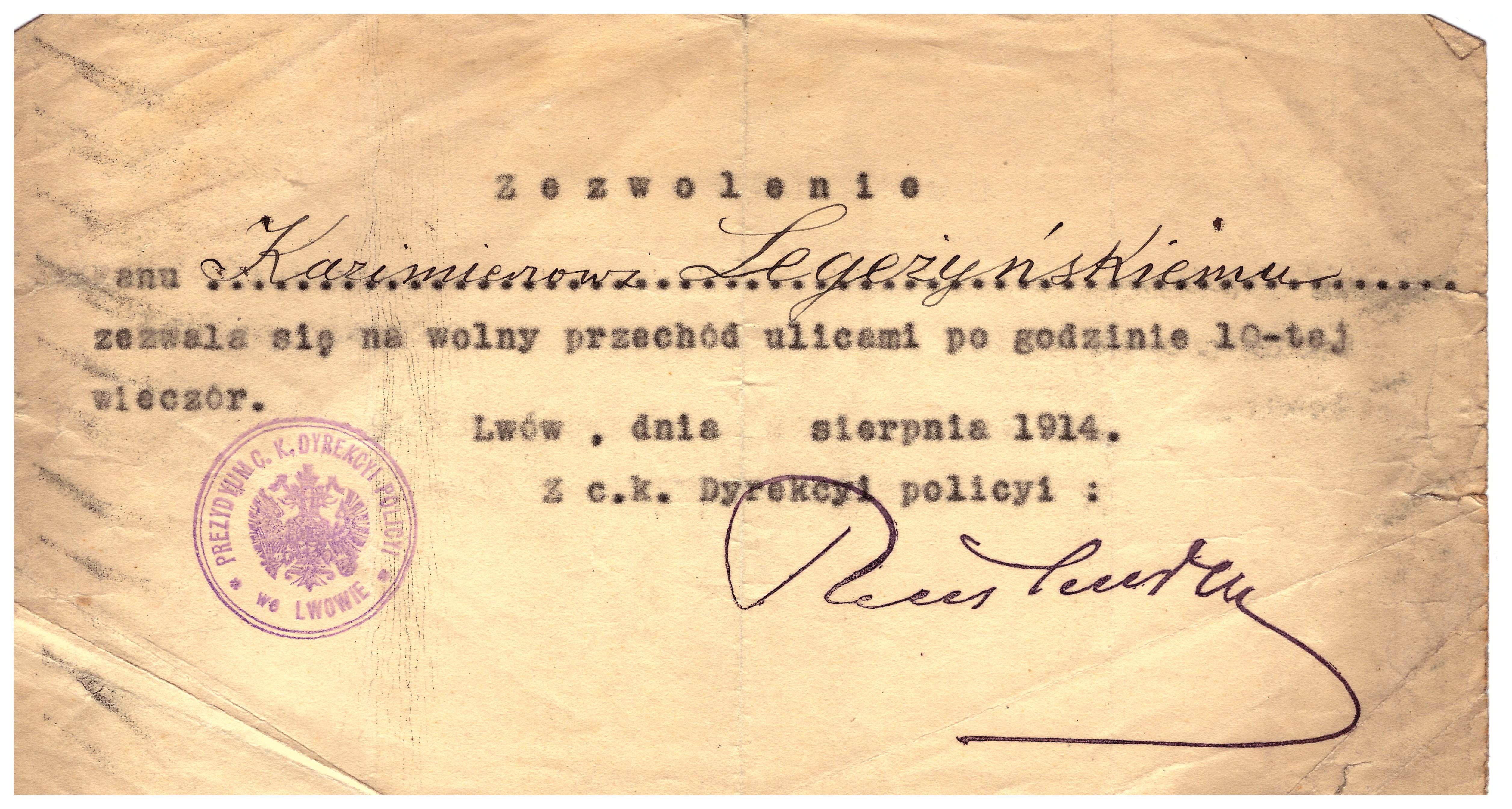 - 1914 Lwów zezwolenie na poruszanie się w godzinach nocnych Kazimierz Legeżyński dyr schroniska dla kobiet