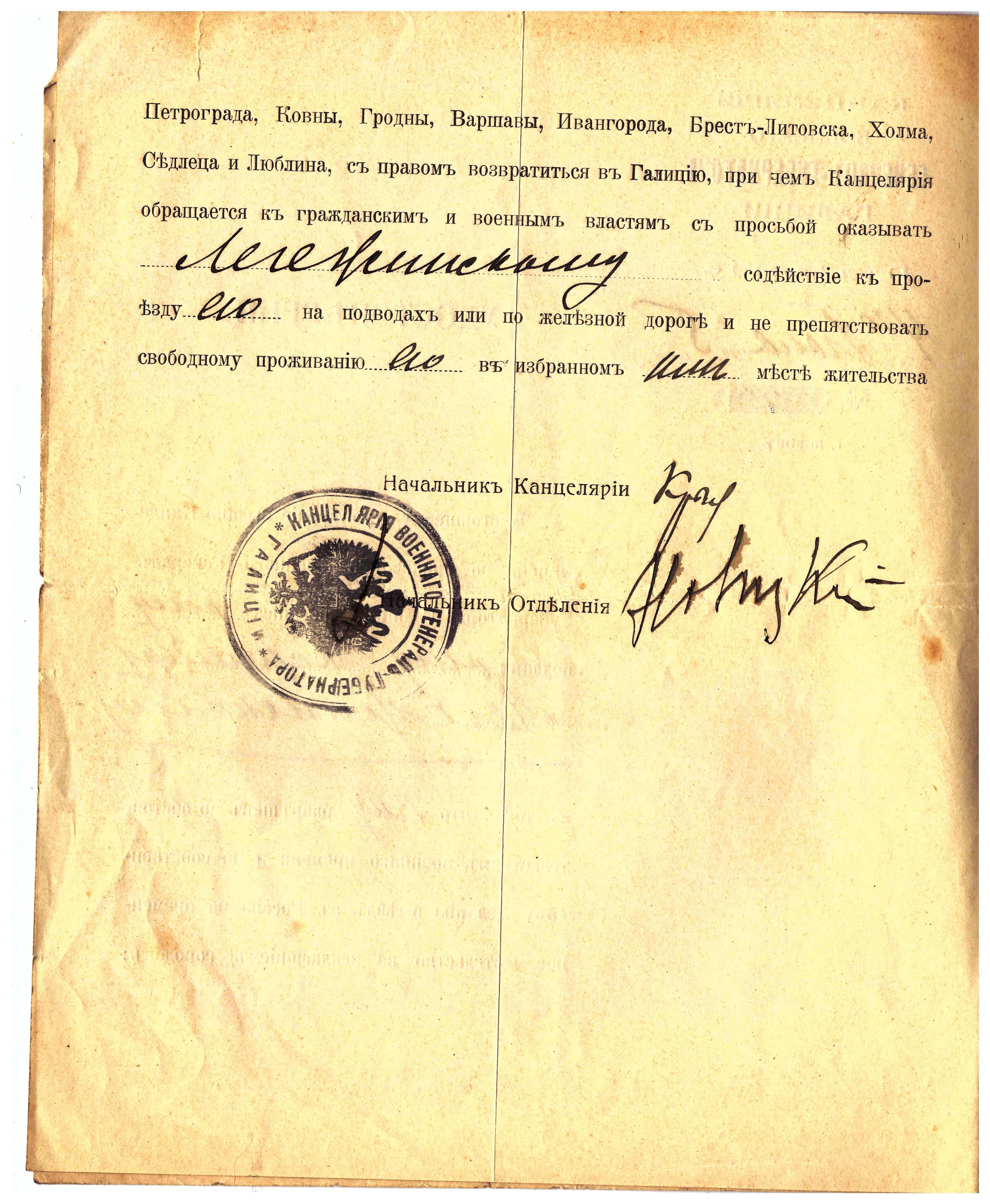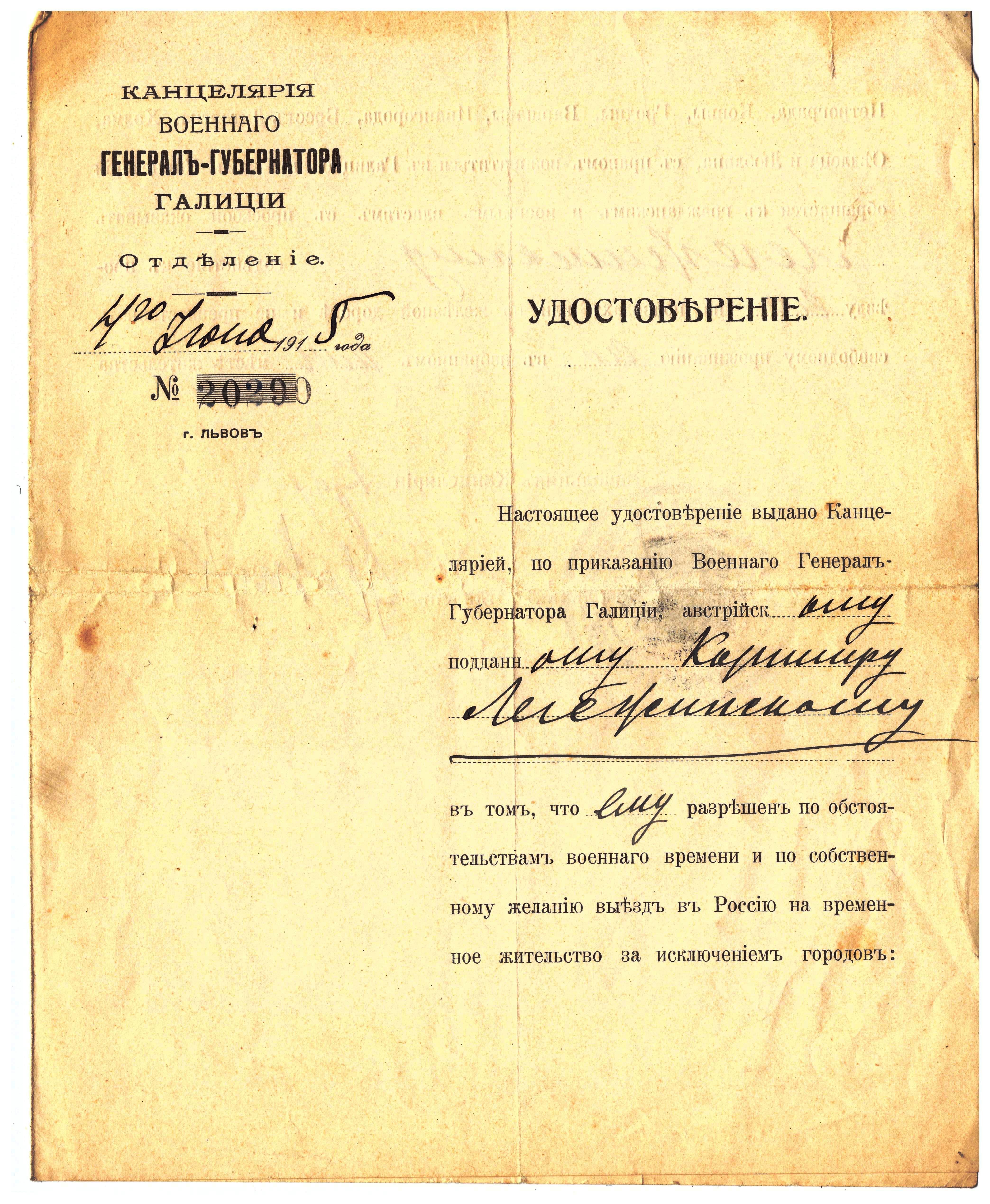- 1915 Lwów zezwolenie rosyjskie na wyjazd Kazimierz Legeżyński 1