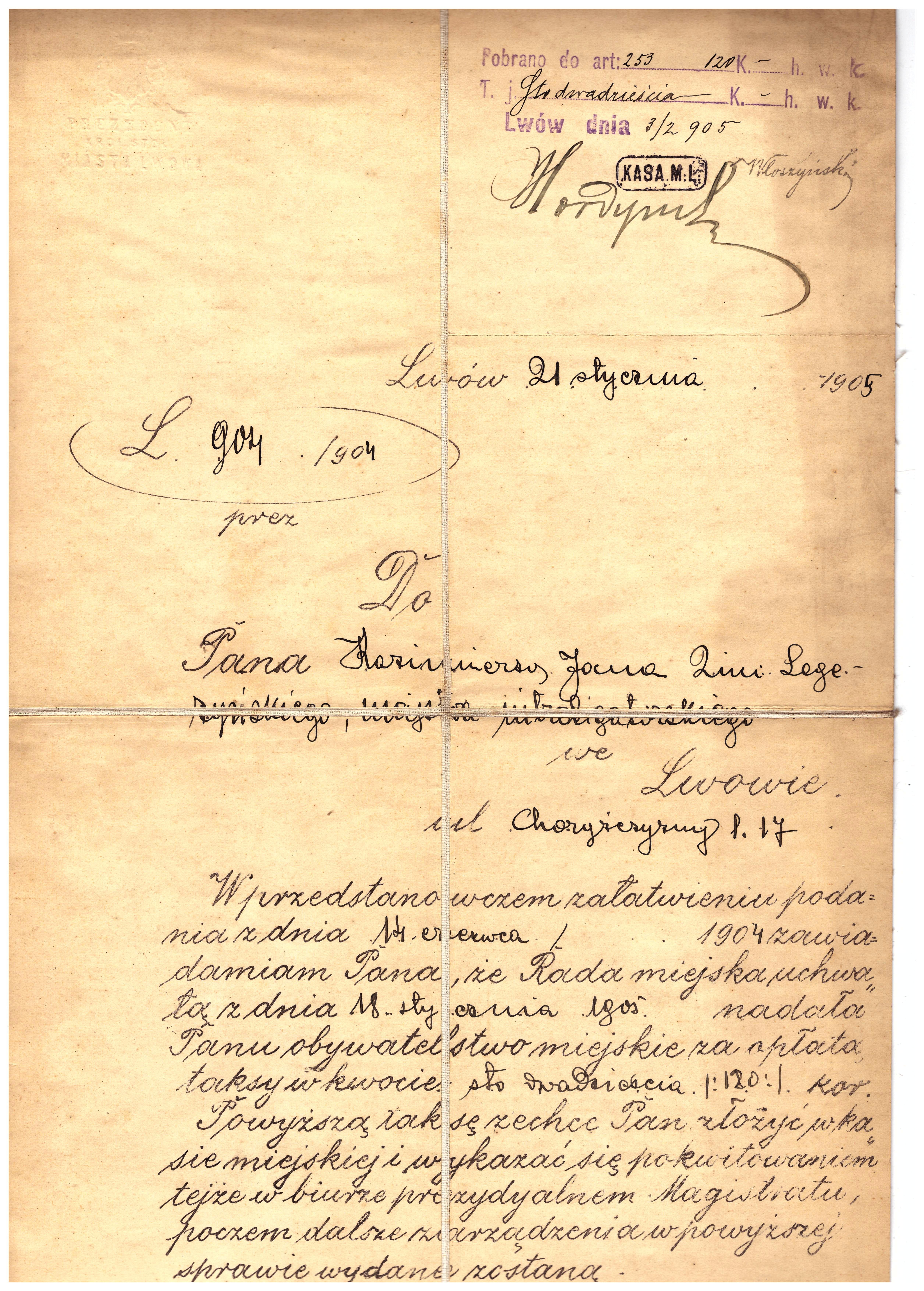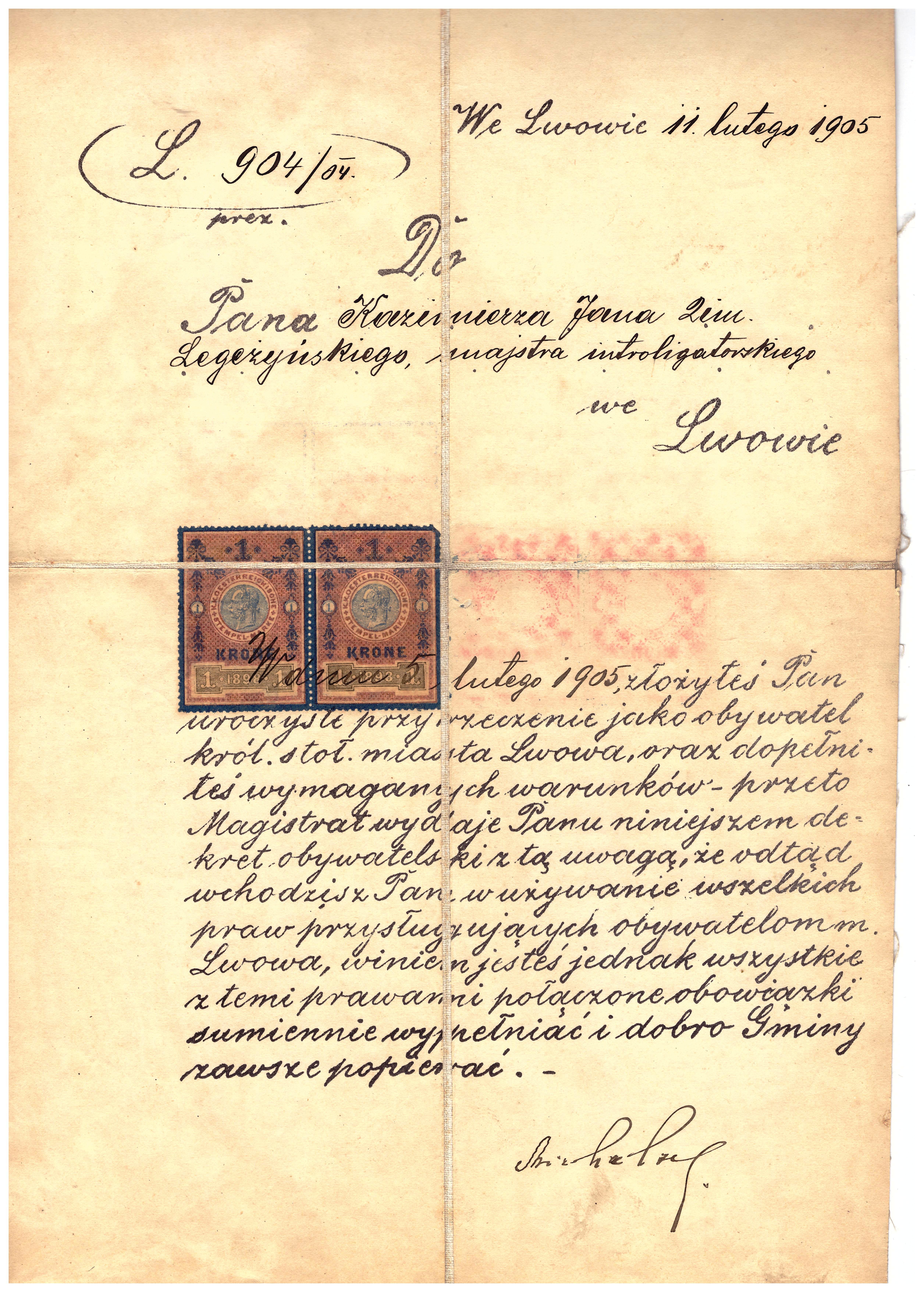 - zawiadomienie o nadaniu obywatelstwa Lwowa 1905 Kazimierz Legeżyński