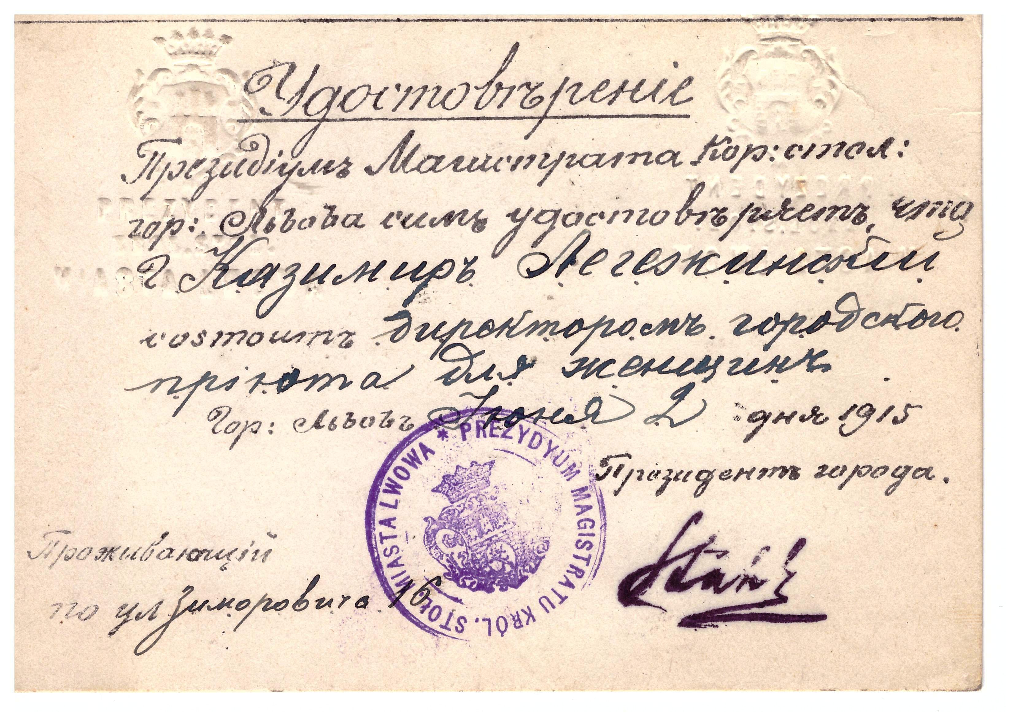 - 1915 Lwów legitymacja polsko-rosyjska Kazimierz Legeżyński dyr schroniska dla kobiet 1