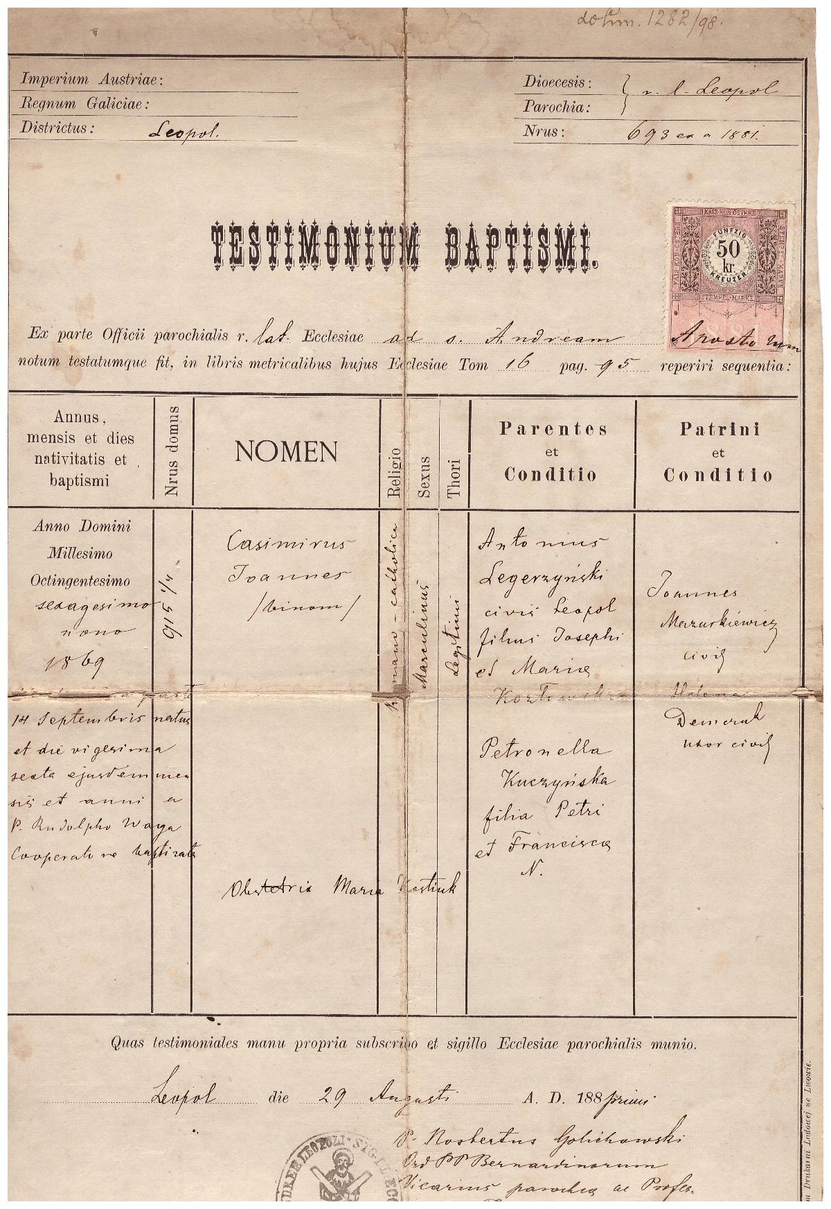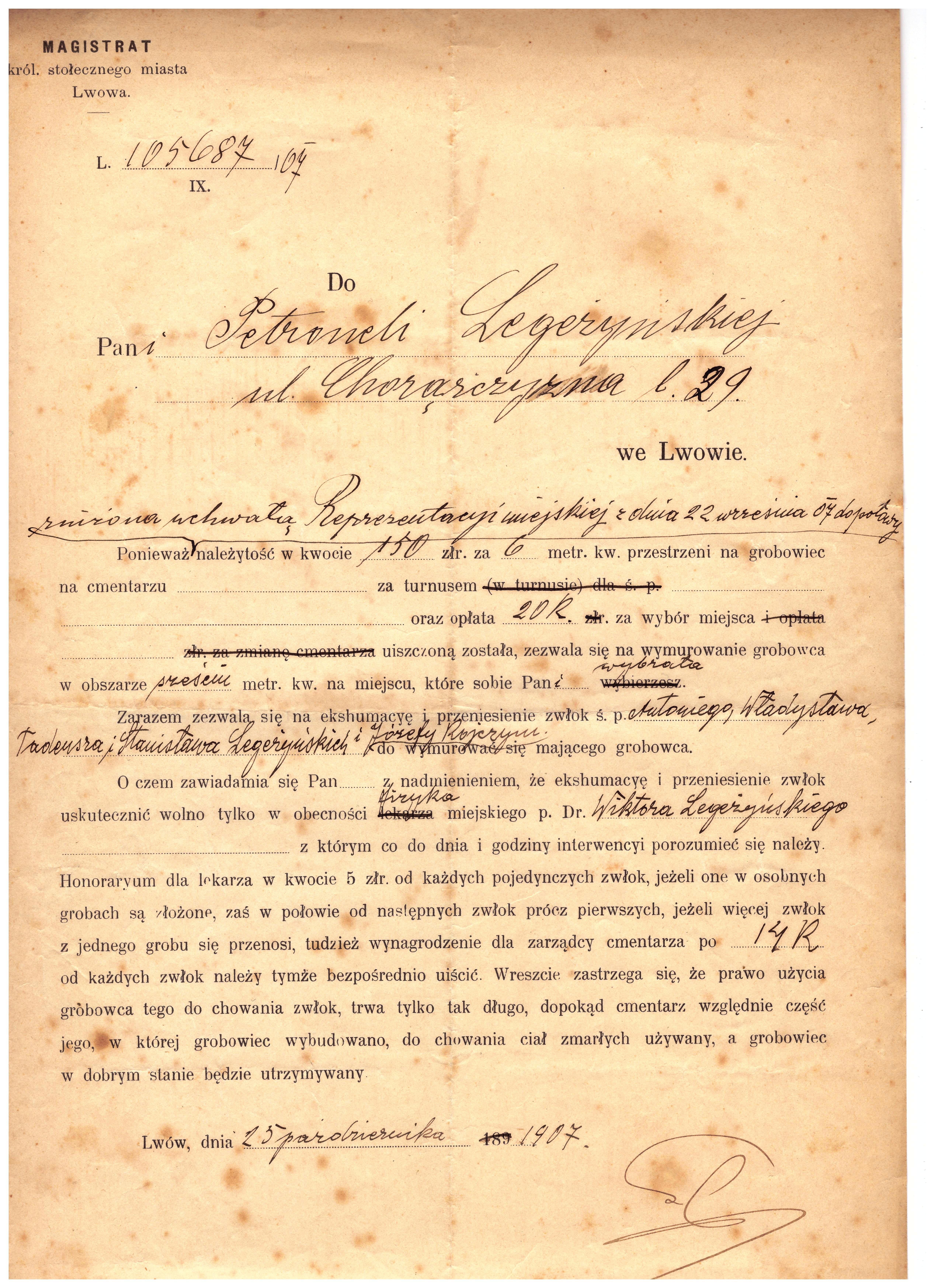 - Lwów 1907 zezwolenie na wybudowanie grobowca na cmentarzu Łyczakowskim Kazimierza Legeżyńskiego