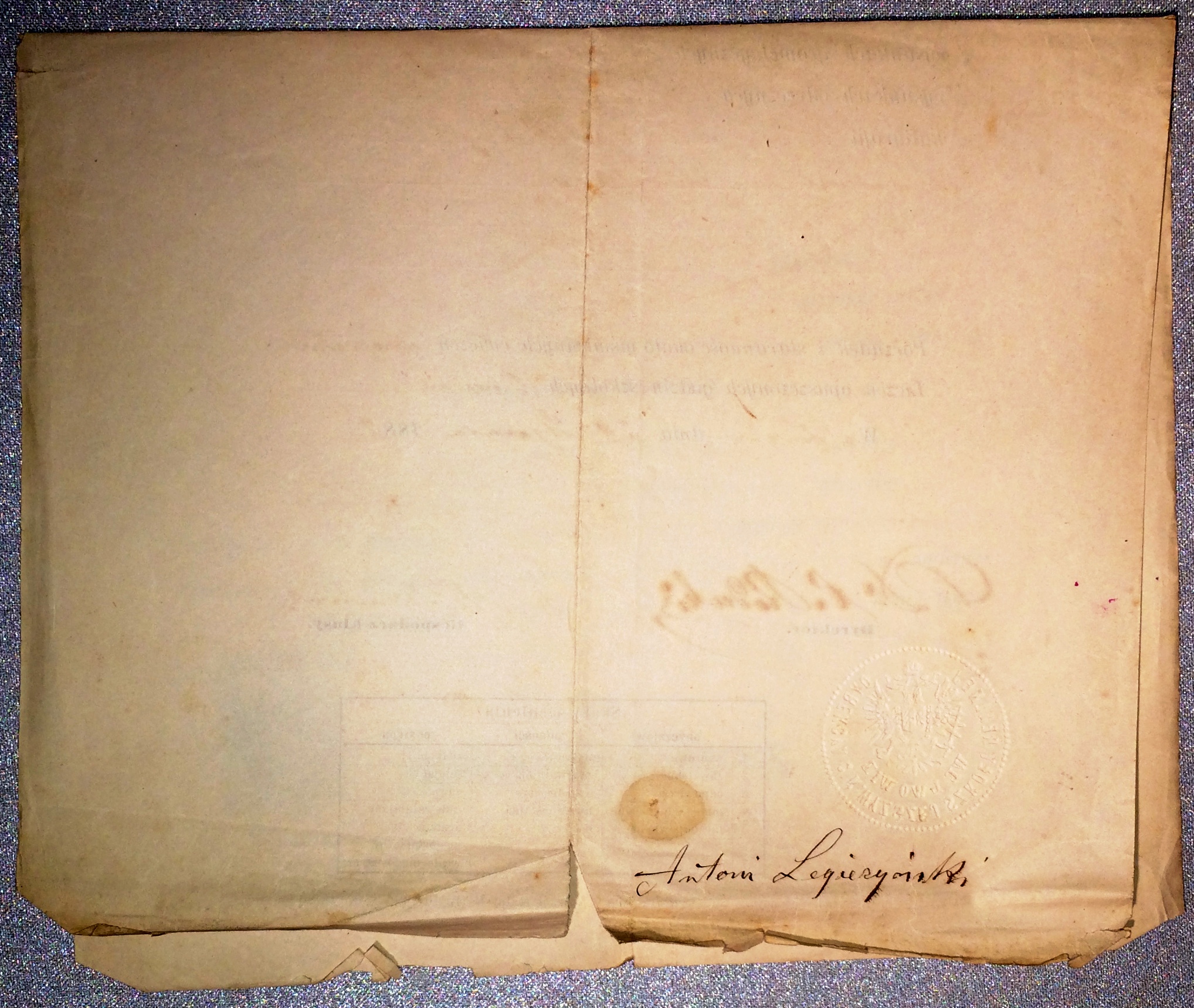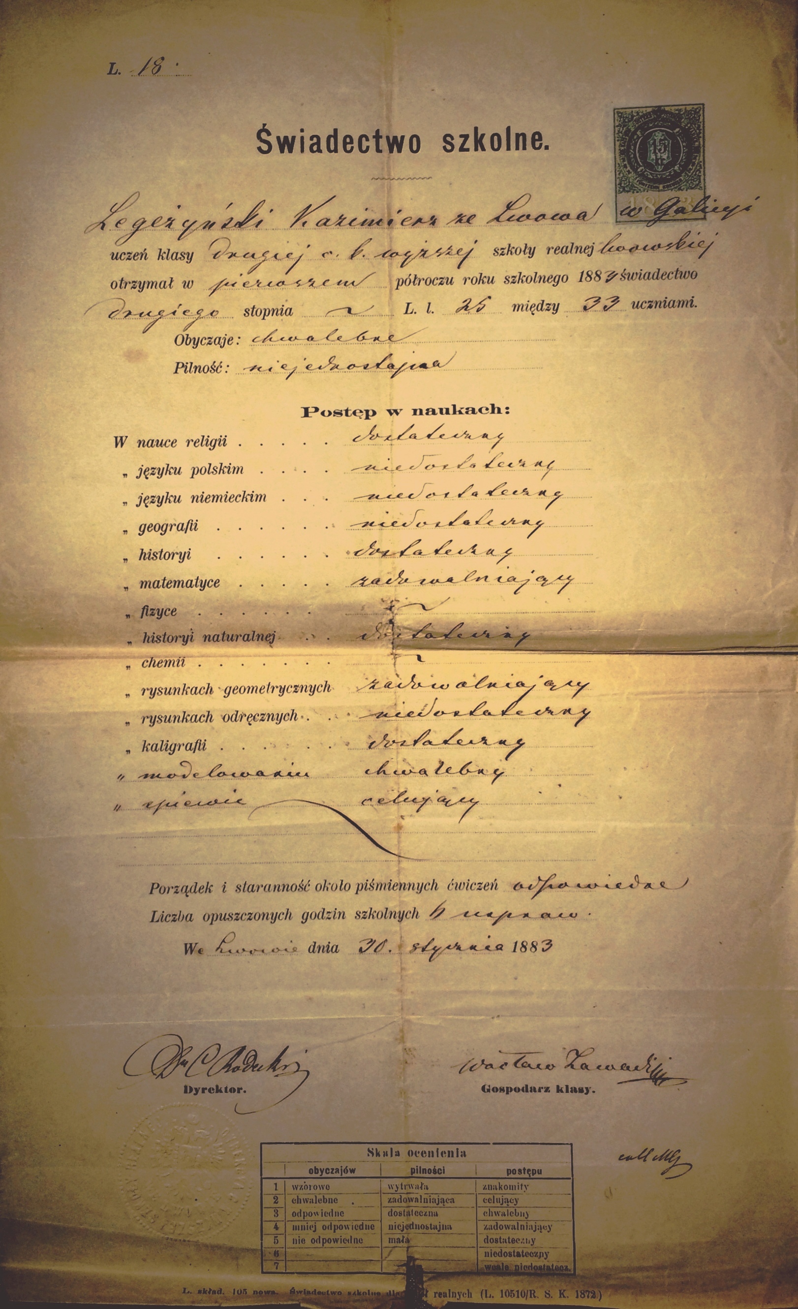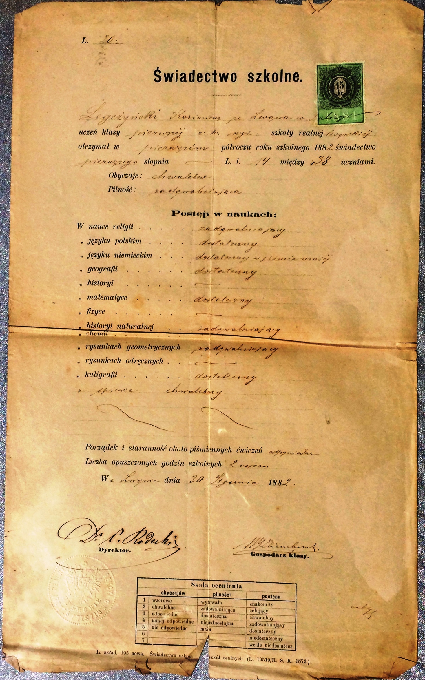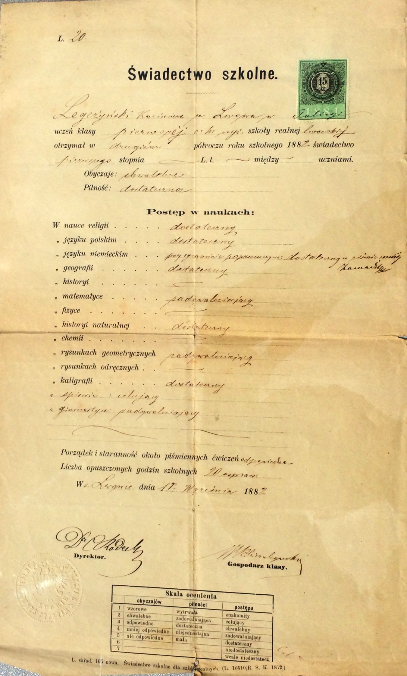 - Lwów 1882r świadectwo I półrocze klasy pierwszej szkoły realnej Kazimierz Legeżyński, podpis ojca Antoniego