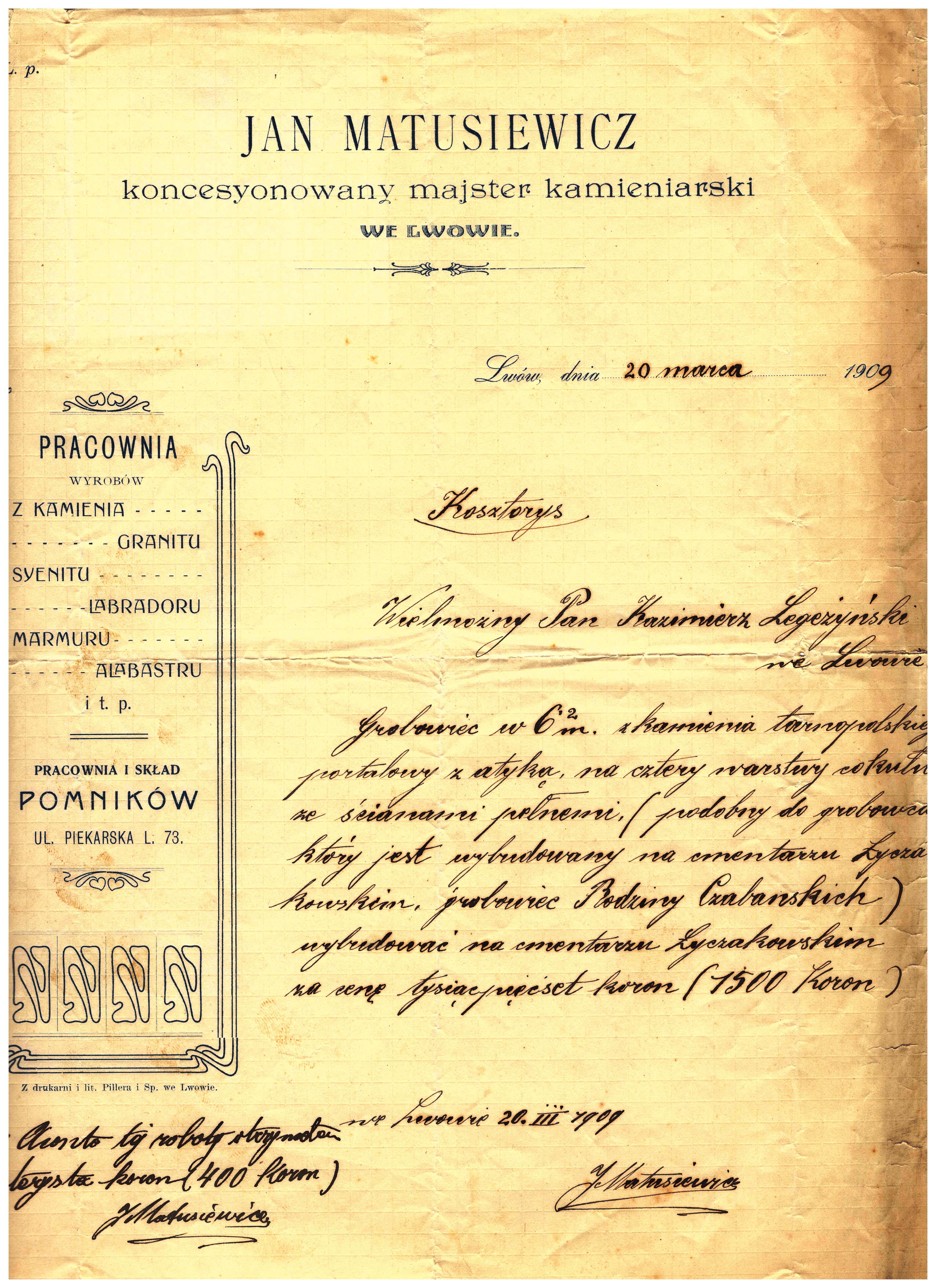 - Jan Matusiewicz koncesyonowany majster kamieniarski Lwów 1909 r kosztorys grobowca cmentarz Łyczakowski Kazimierza Legeżyńskiego