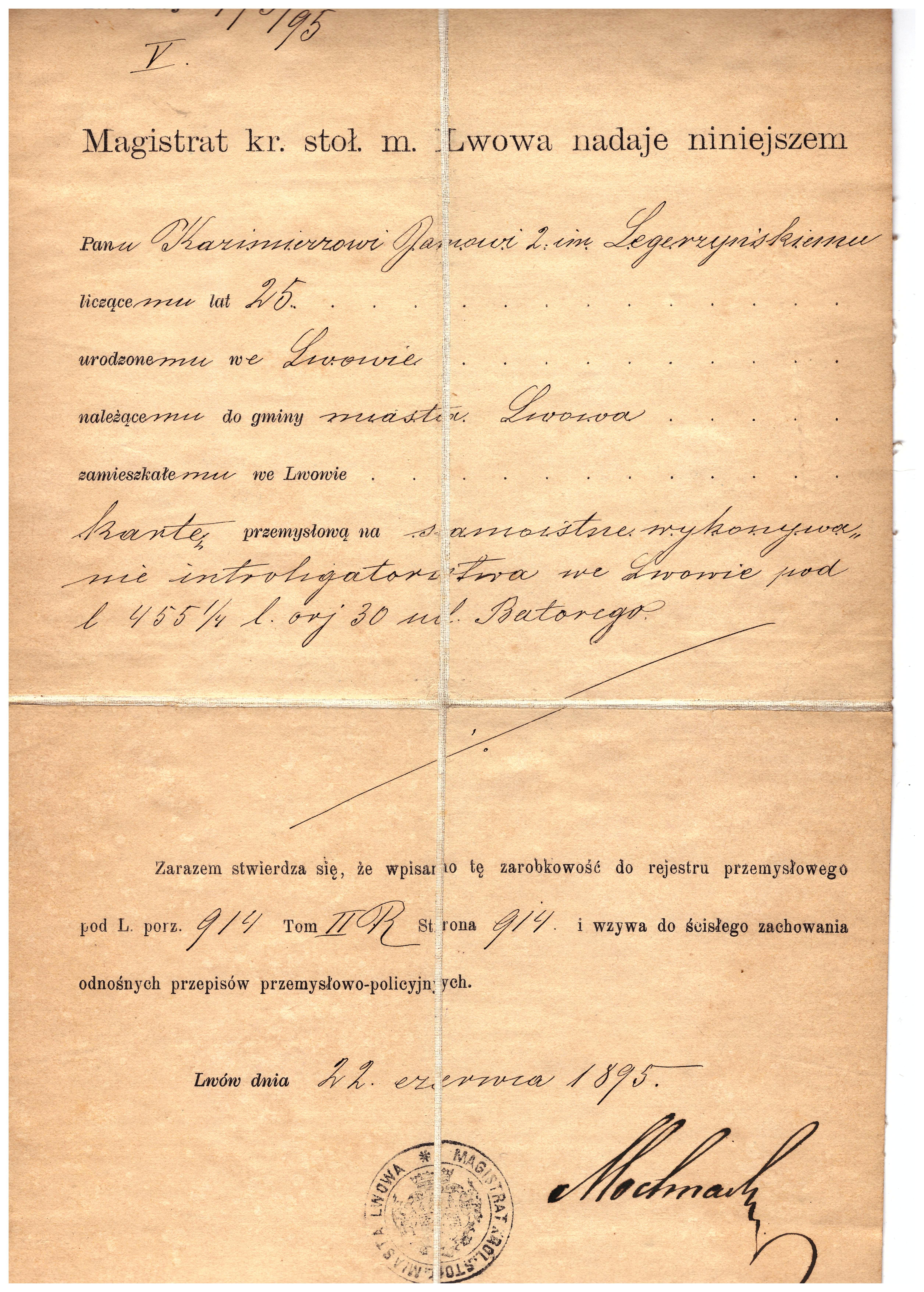 - Karta przemysłowa Lwów 1895 r dokument nadania dla Kazimierza Legeżyńskiego
