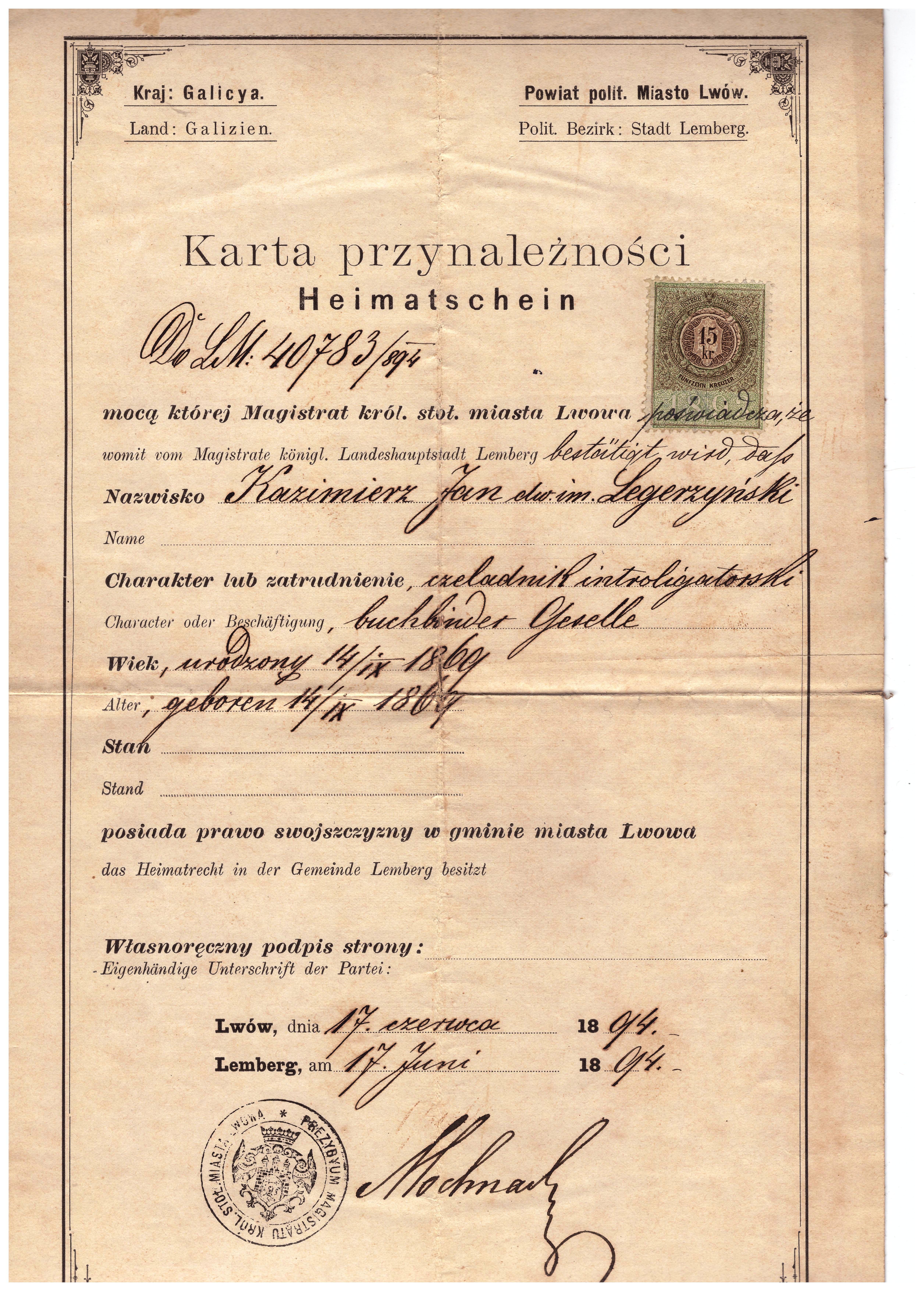 - karta przynależności z prawem swojszczyzny Lwów 1894 r Kazimierz Legeżyński