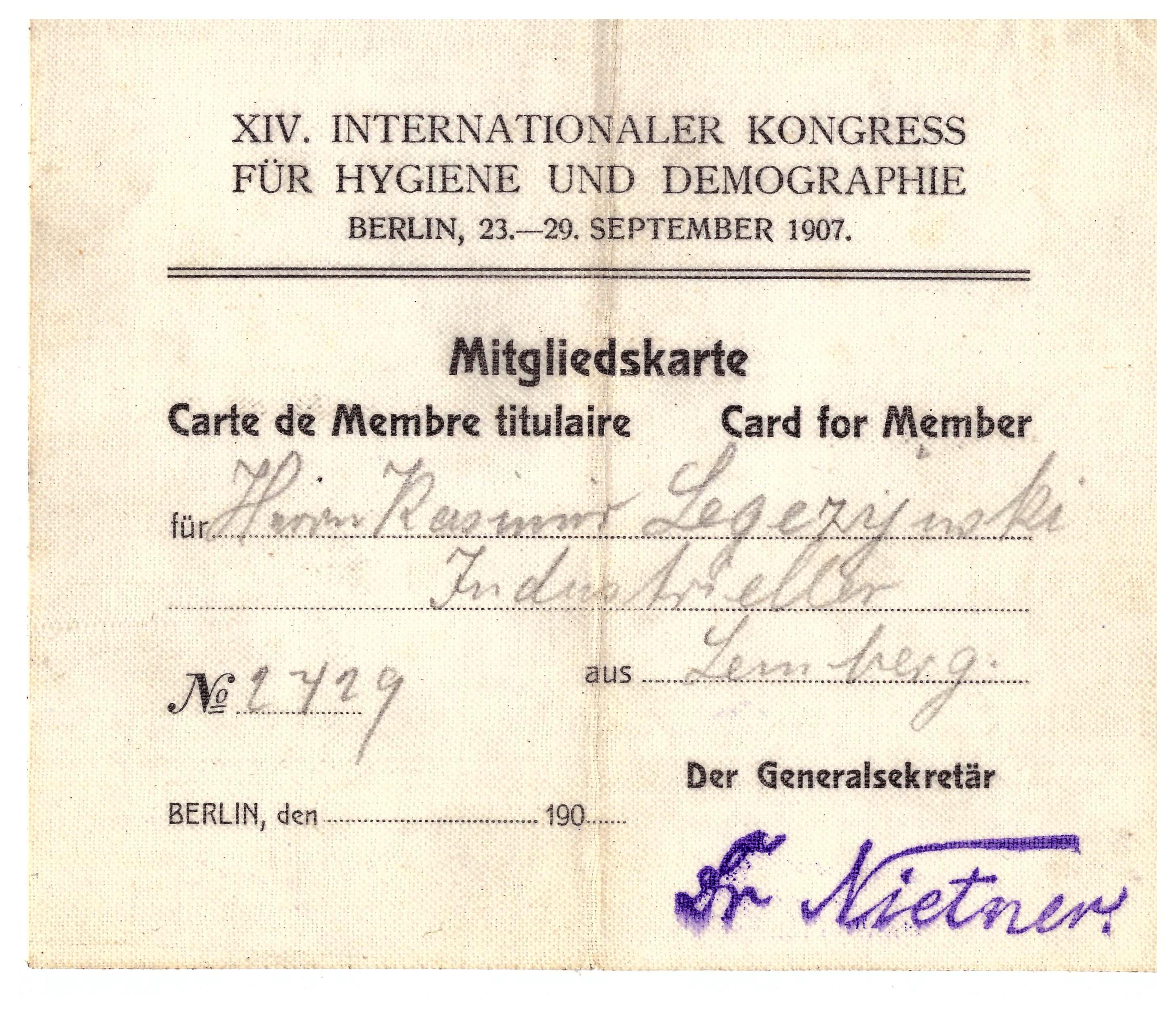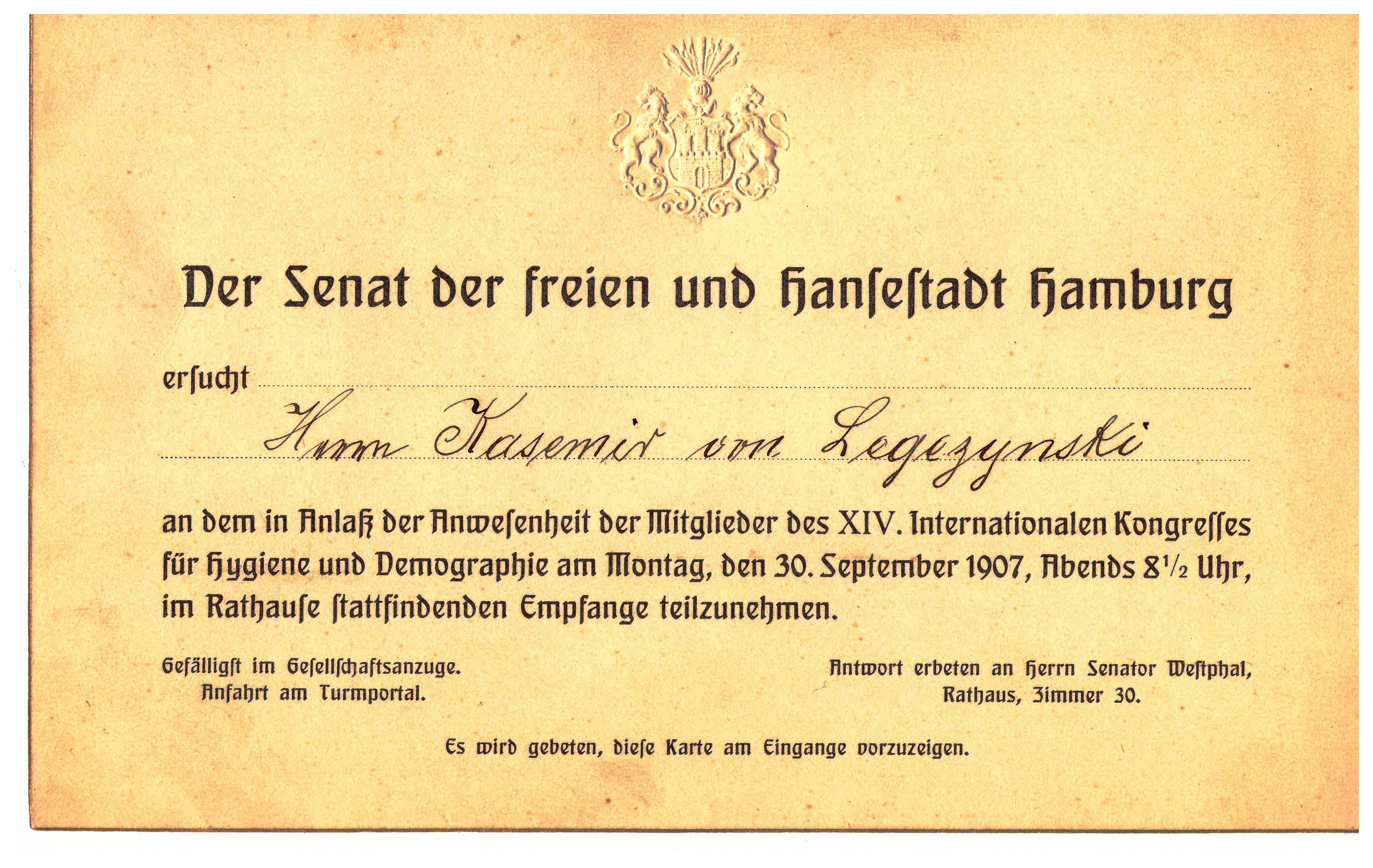 - Kazimierz Legeżyński zaproszenie Senatu Hamburga dla uczestnika XIV Internationalen Kongress fur Hygiene und Demographie Berlin 1907 r