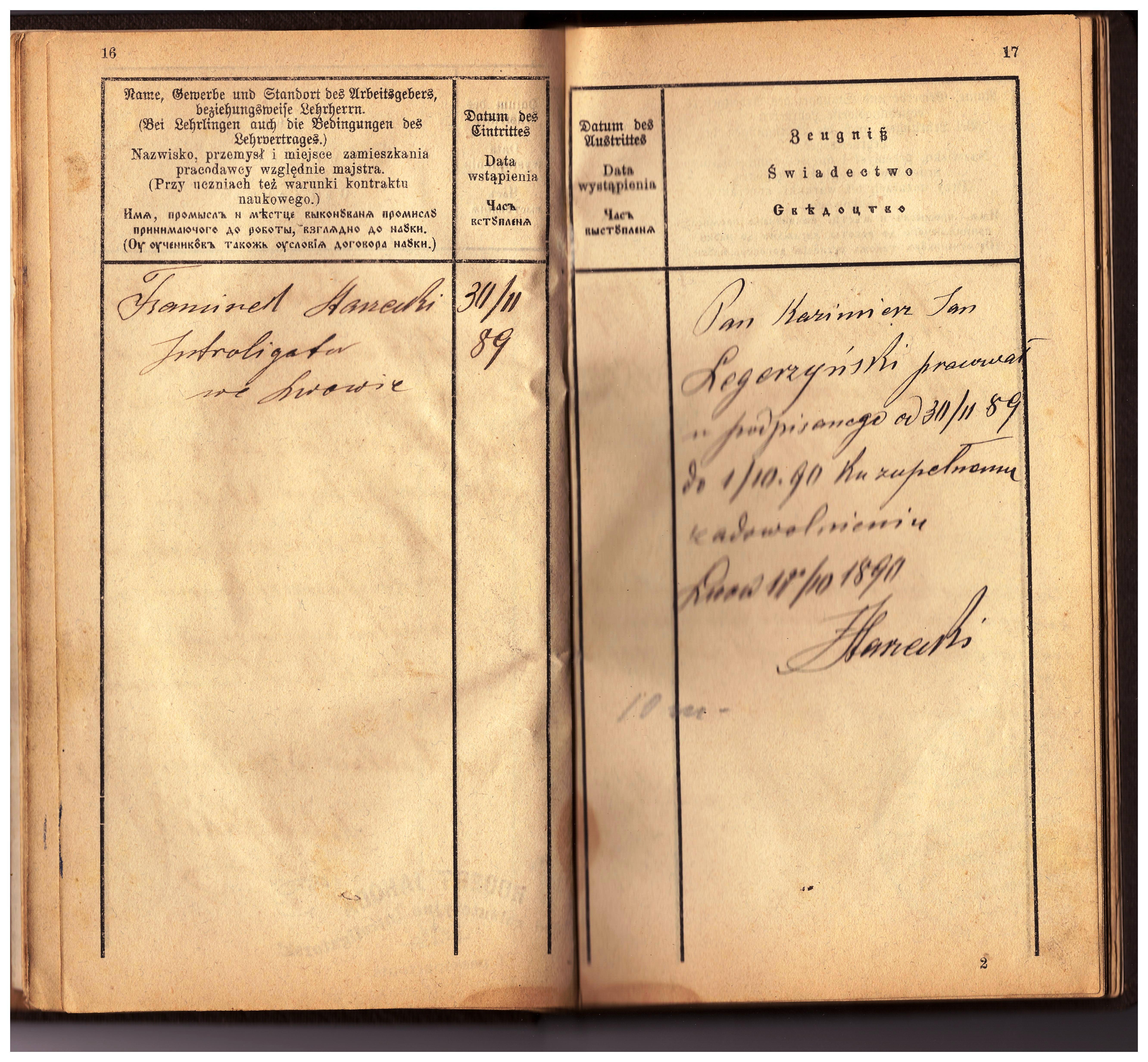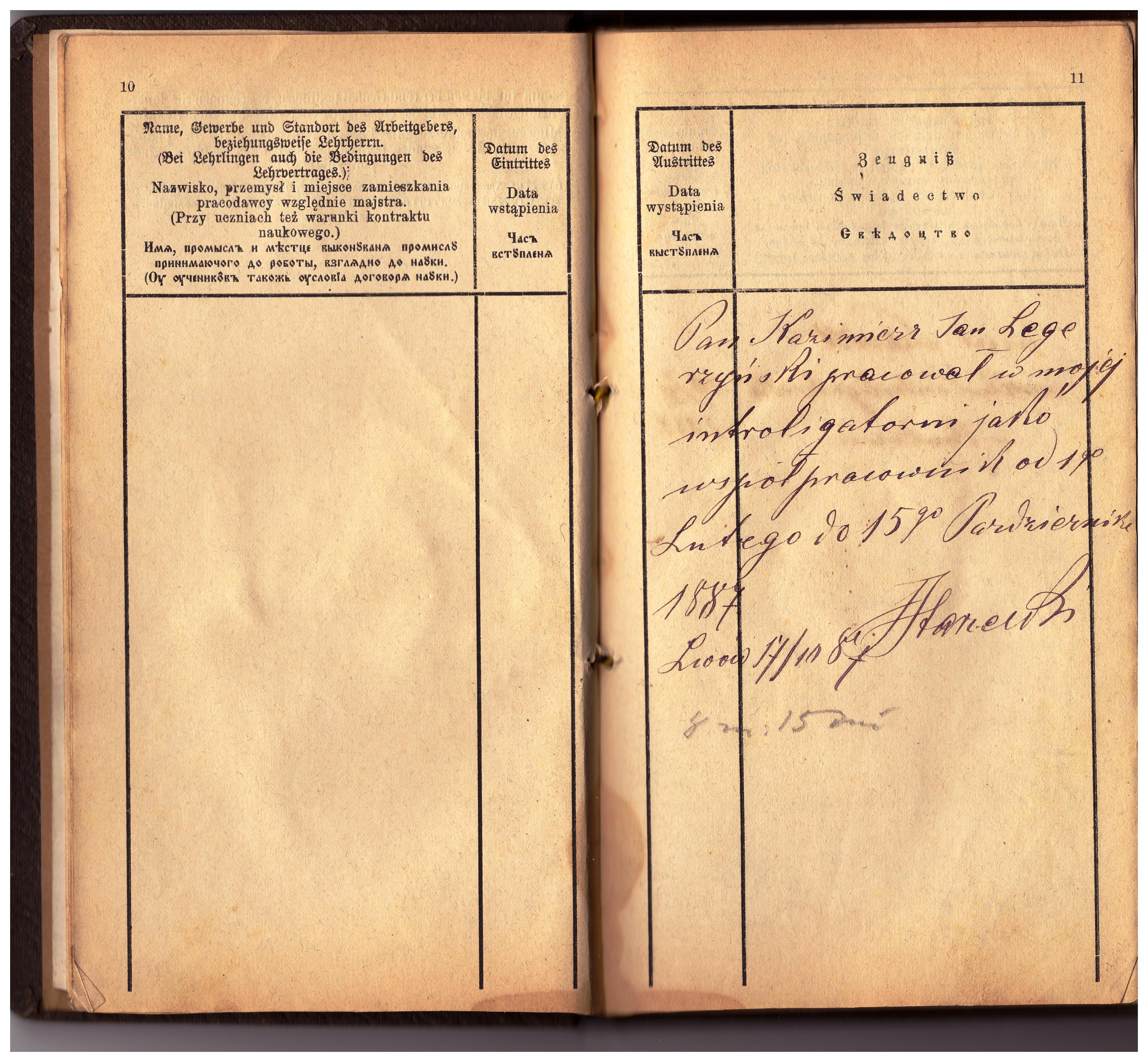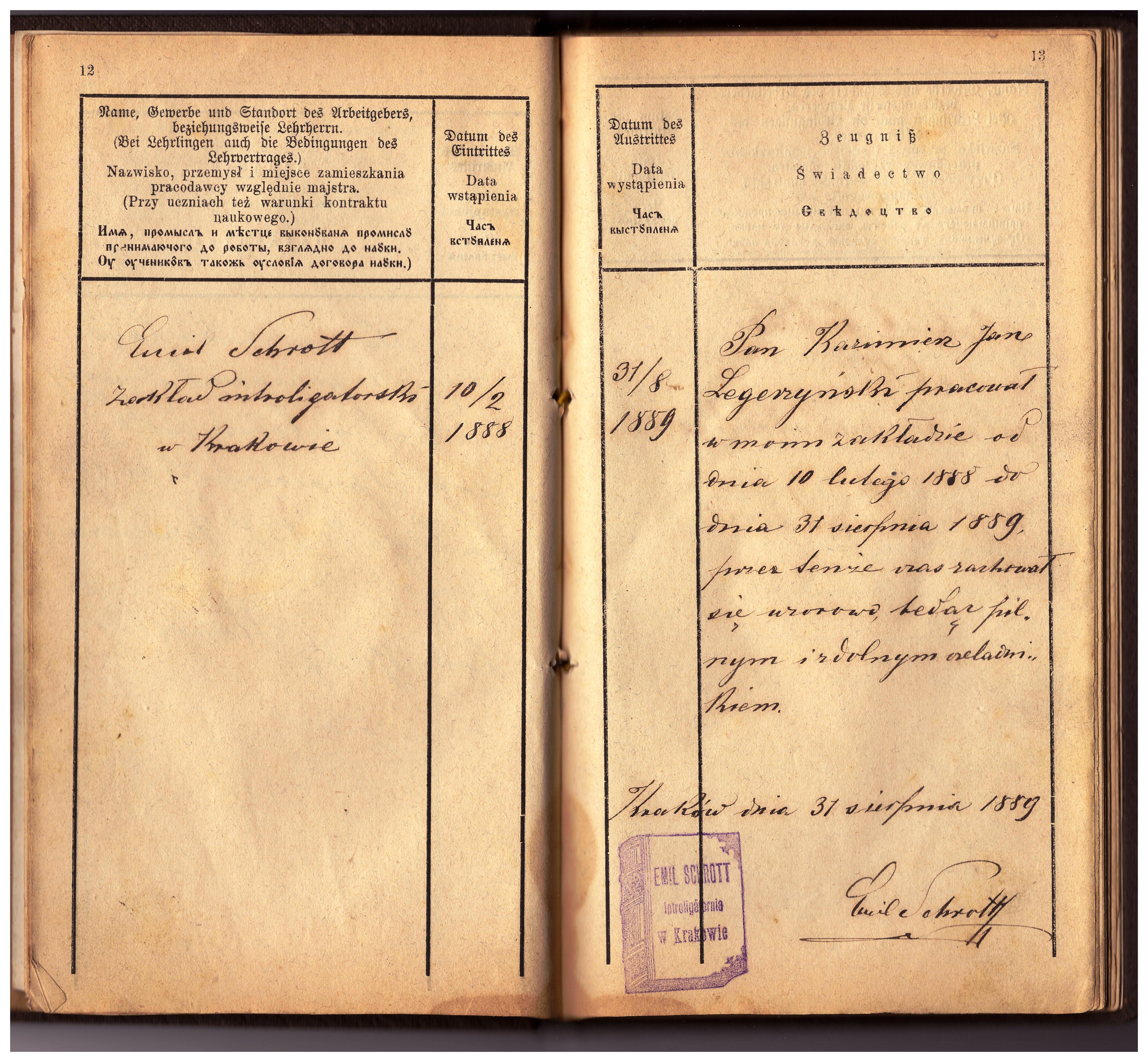 - Lwów 1886r świadectwo Miejskiej Szkoły Przemysłowej z przyjęcia Kazimierza Legeżyńskiego jako towarzysza sztuki introligatorskiej do Cechu