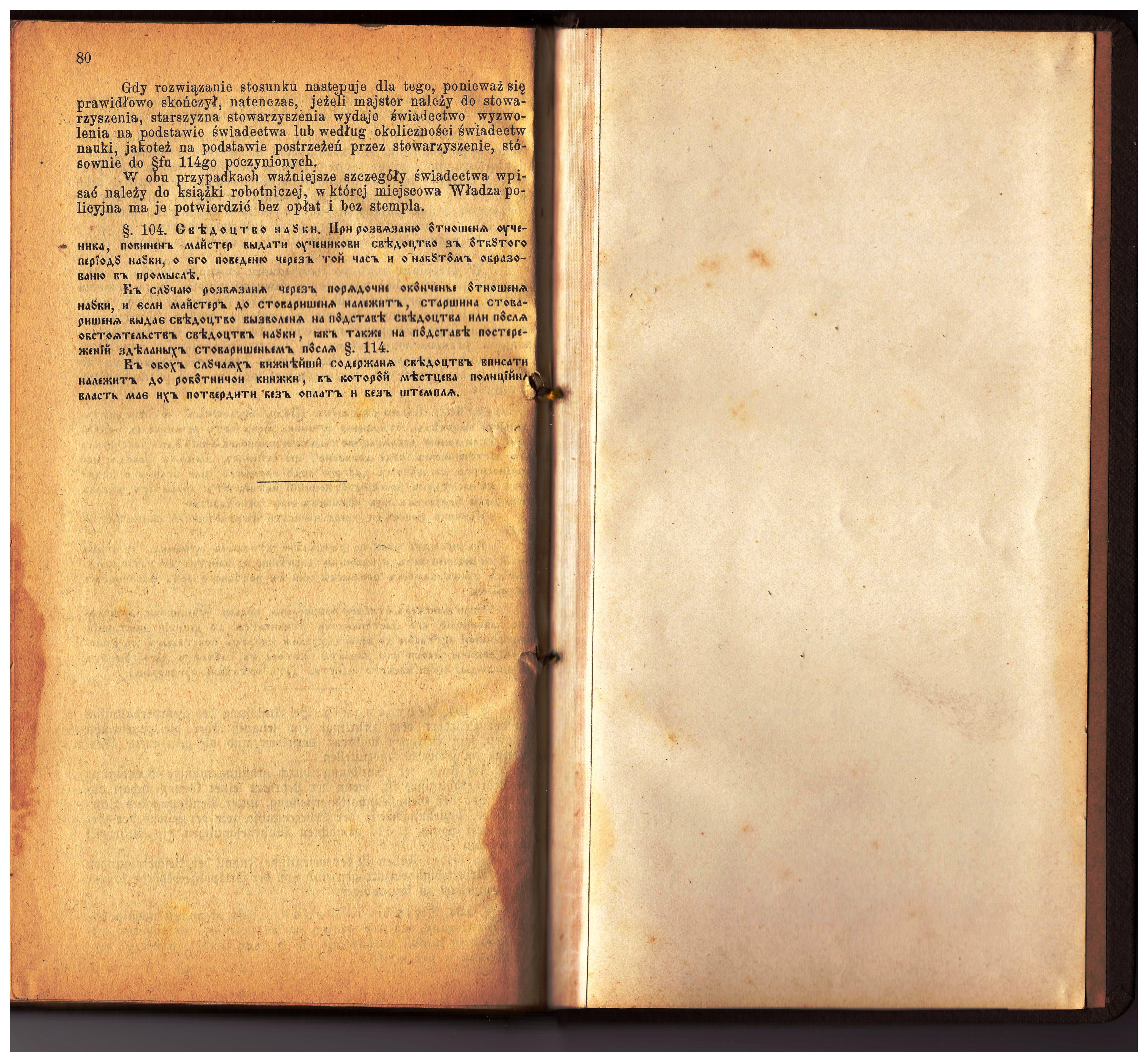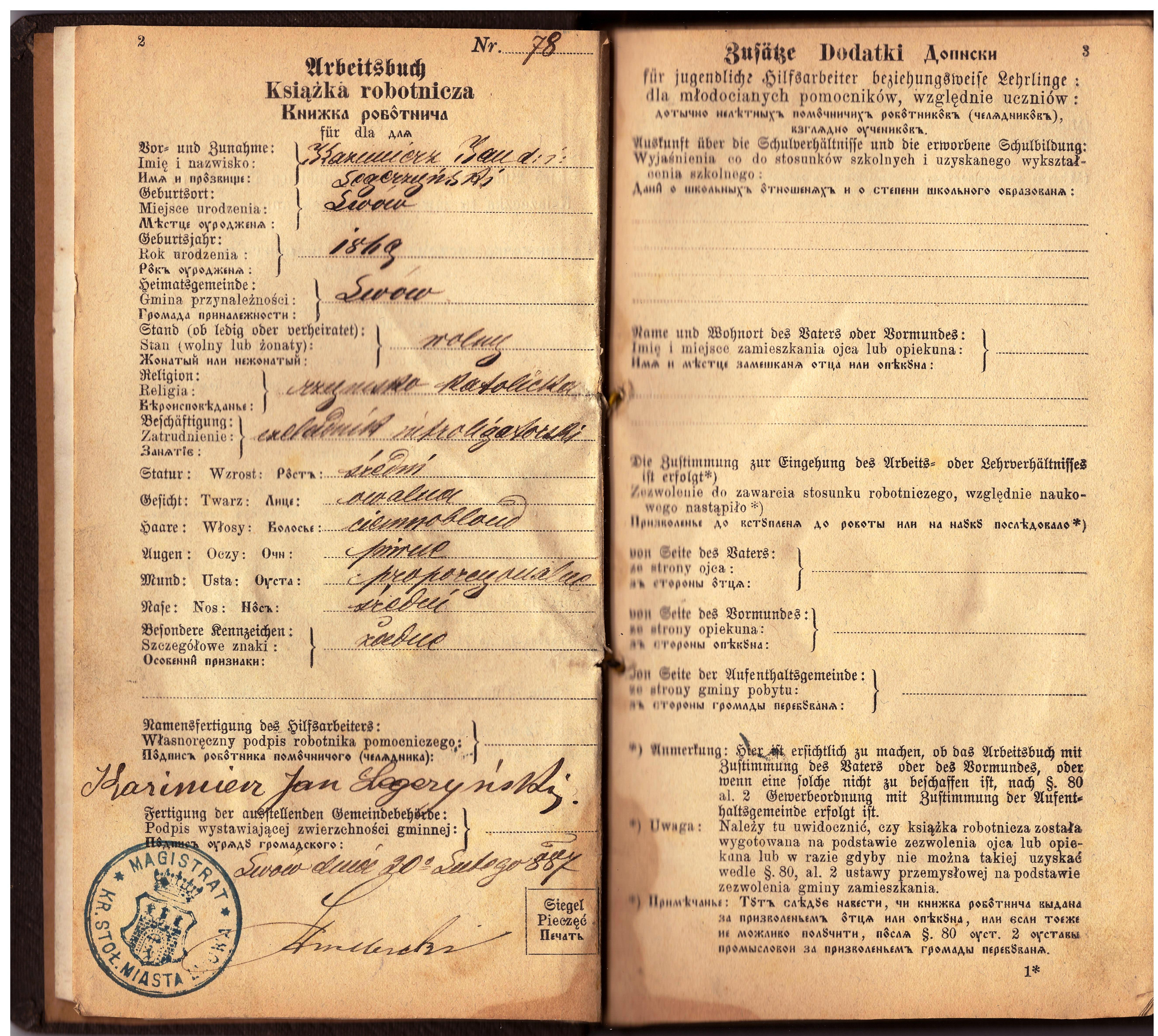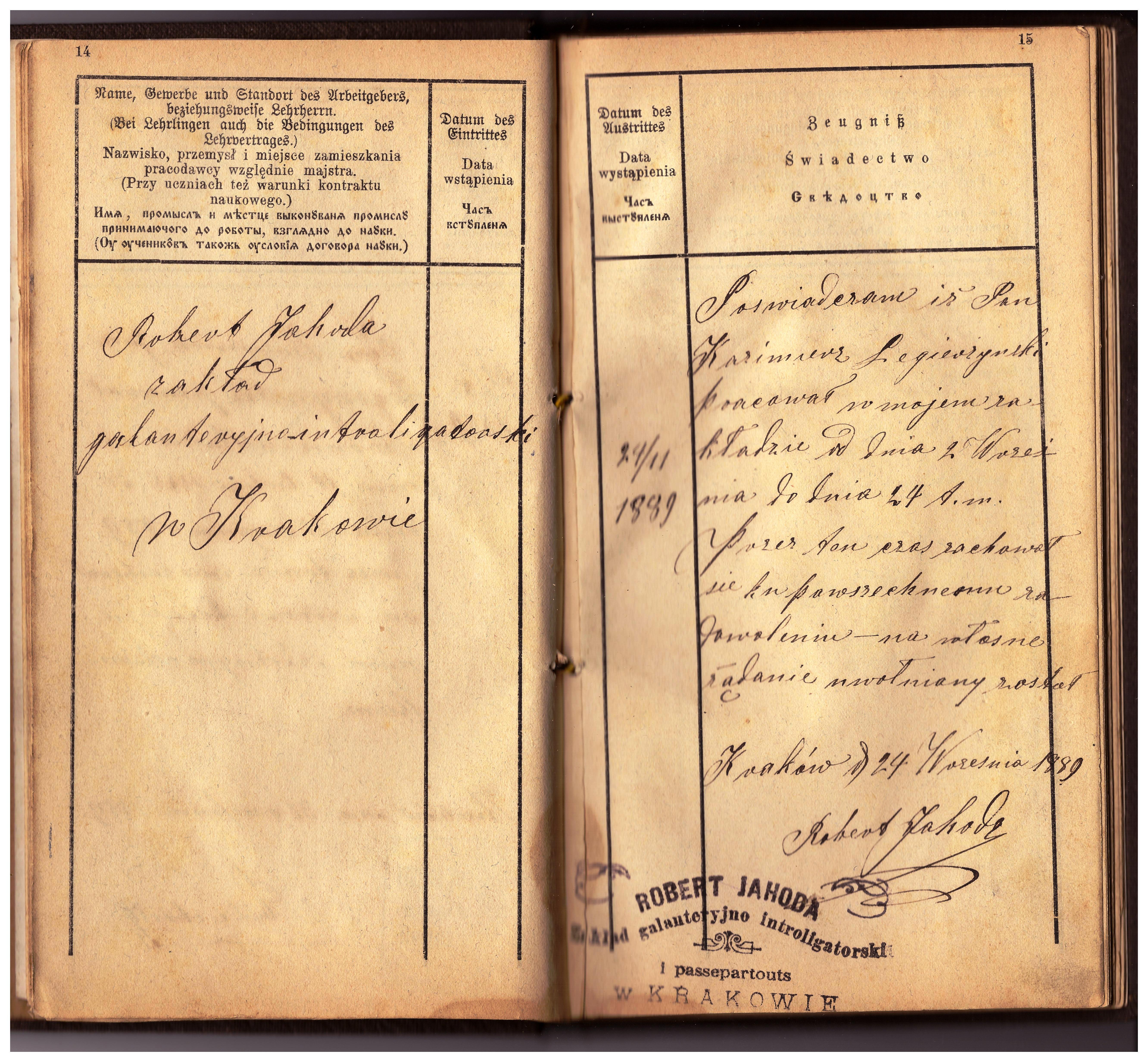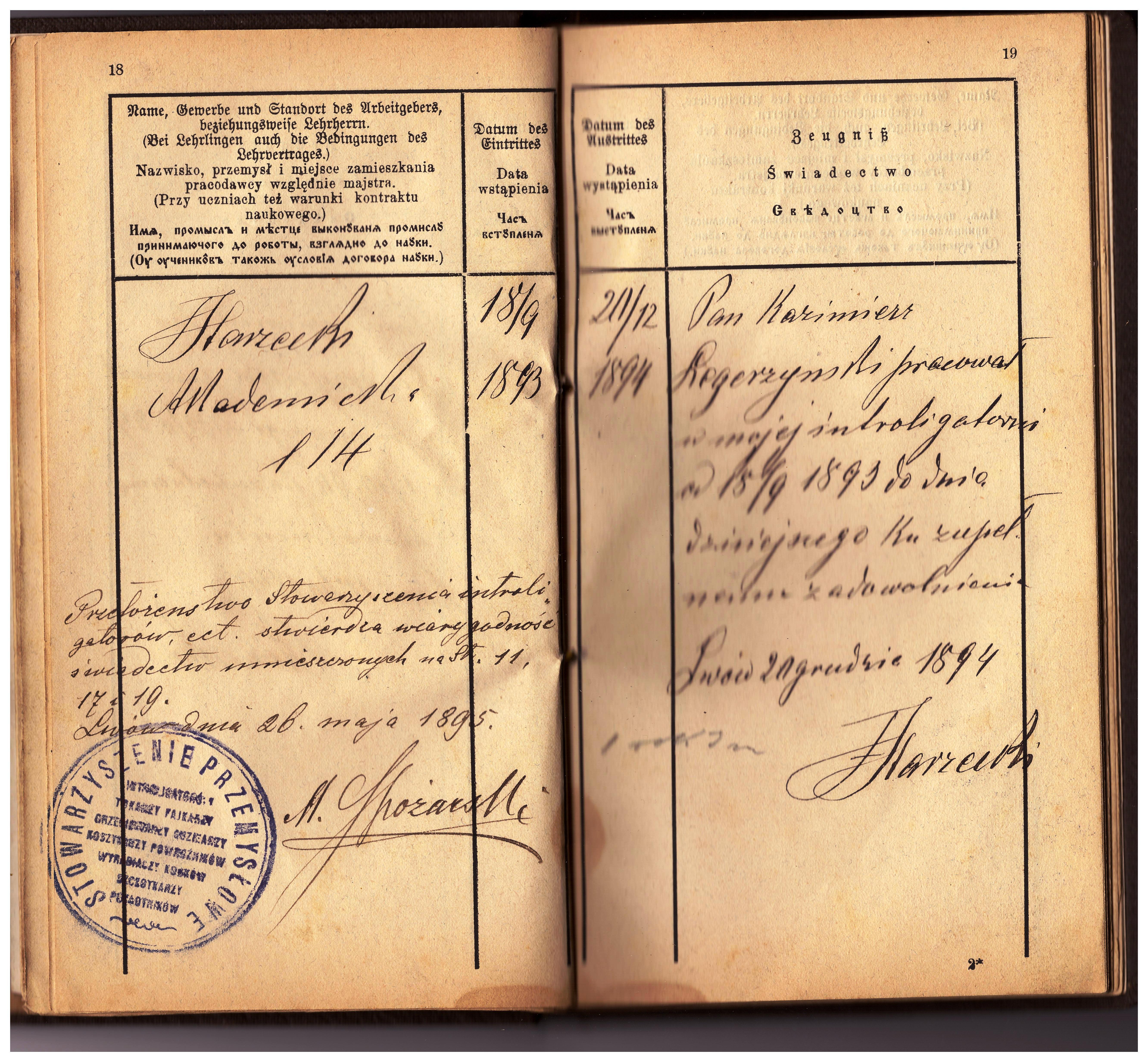 - Lwów 1886r świadectwo Miejskiej Szkoły Przemysłowej z przyjęcia Kazimierza Legeżyńskiego jako towarzysza sztuki introligatorskiej do Cechu