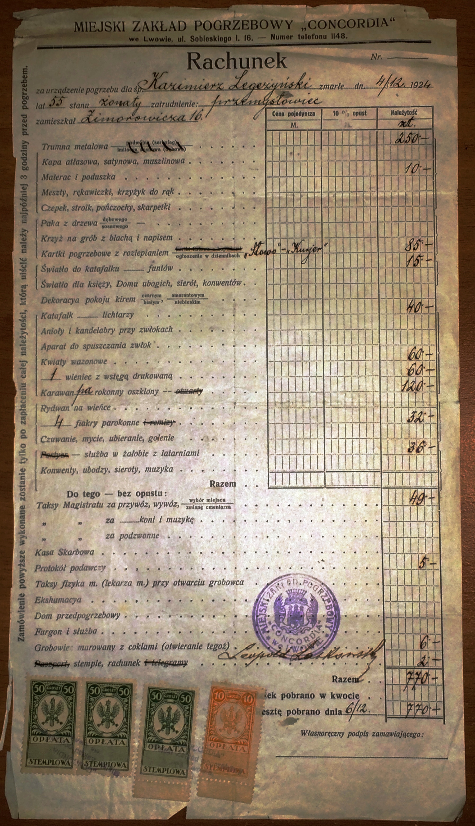 - Lwów 1924 r Miejski Zakład Pogrzebowy Concordia rachunek za pogrzeb Kazimierza Legeżyńskiego