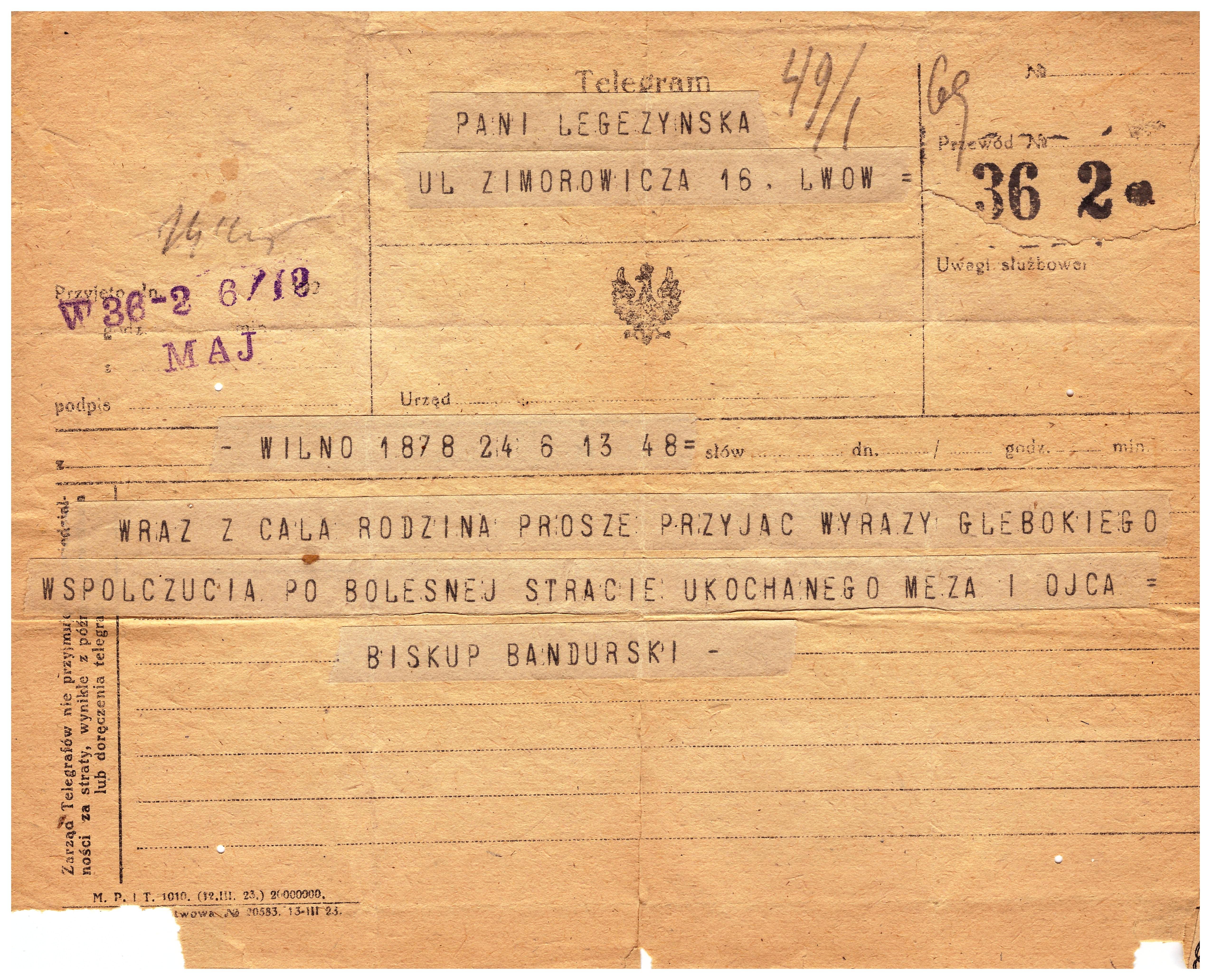 - telegram 1924 r kondolencje biskupa Bandurskiego po Kazimierzu Legeżyńskim