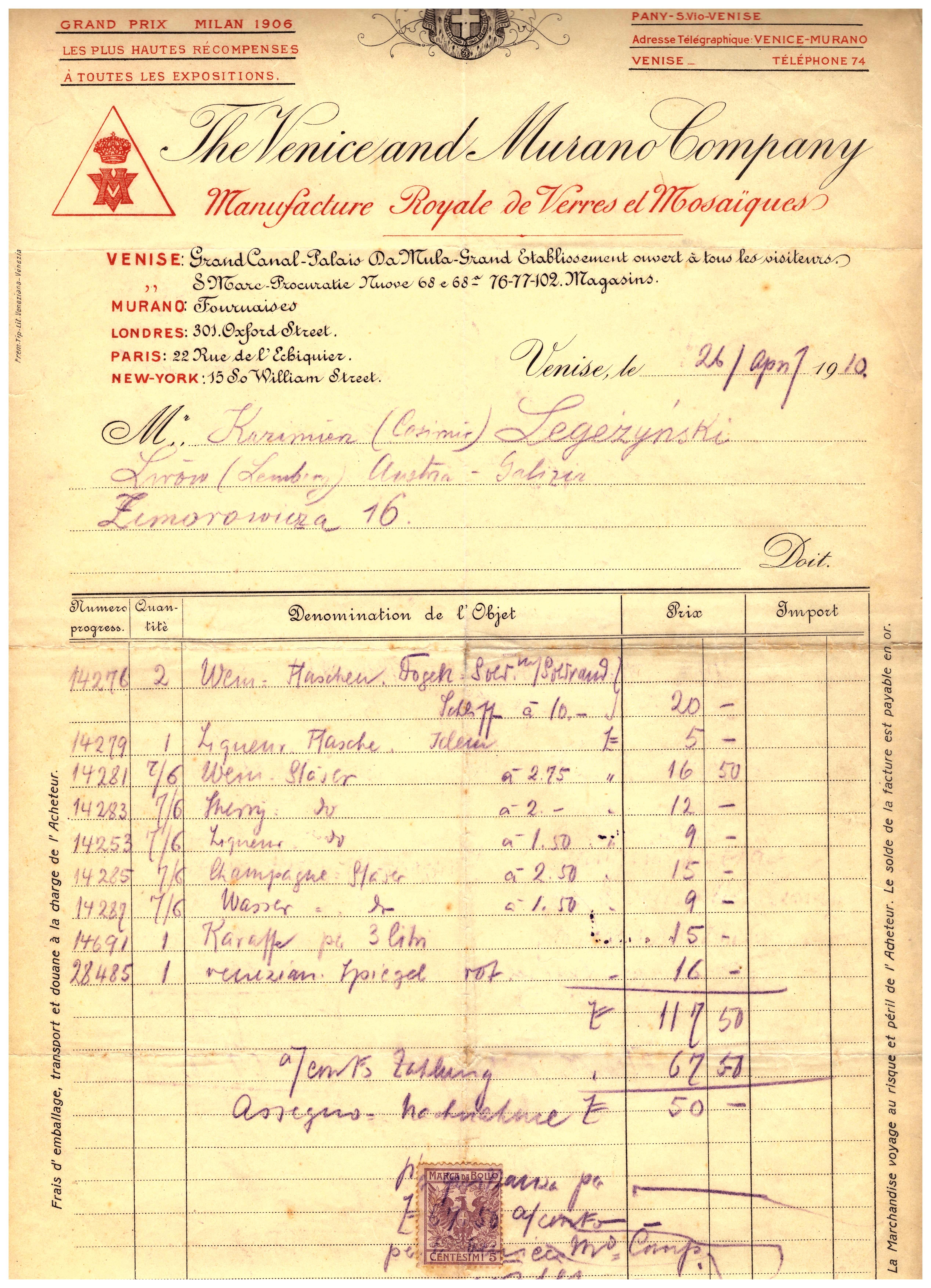 - Venice and Murano company 1910 rachunek dla Kazimierza Legeżyńskiego