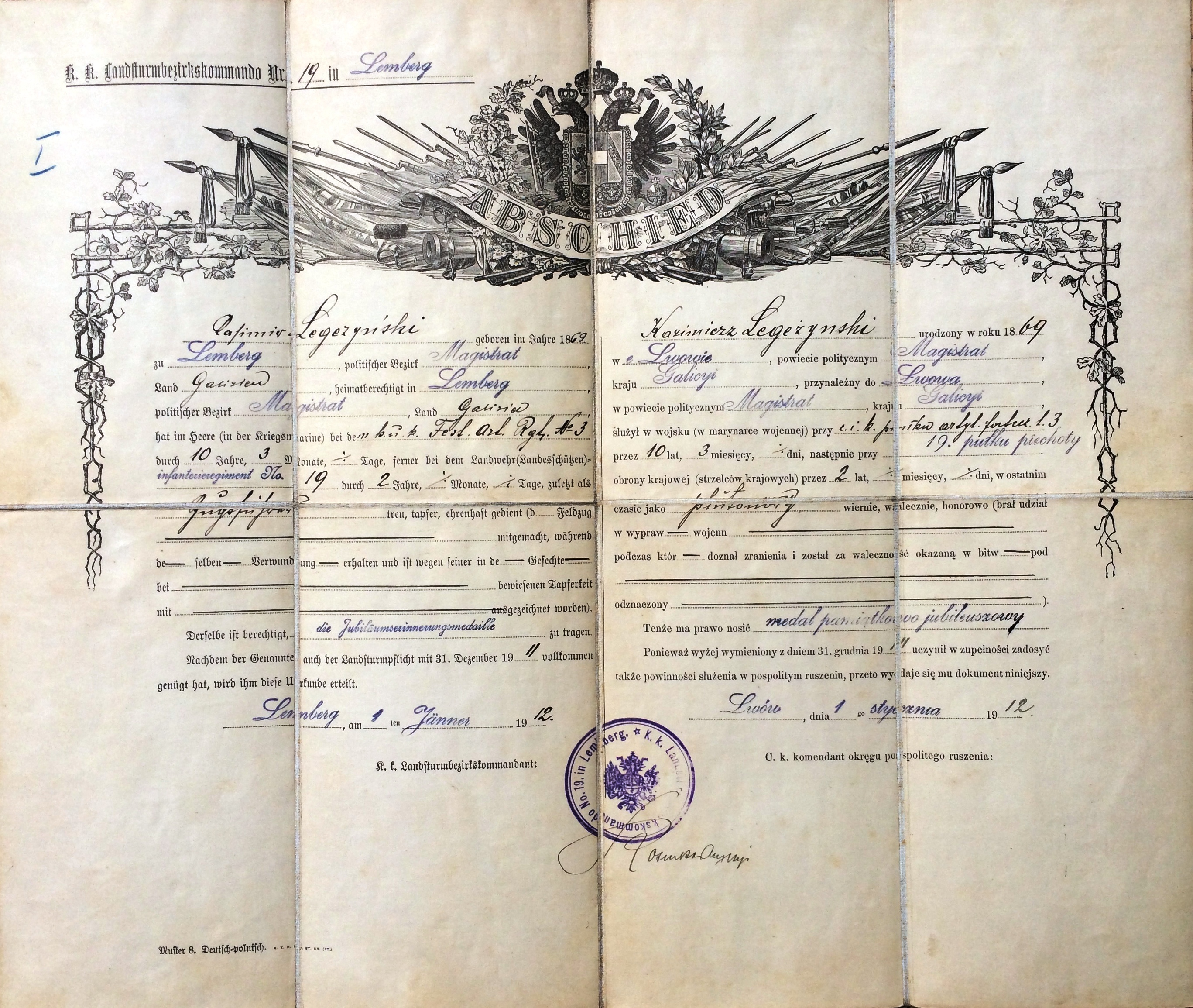 - zaświadczenie o zakończeniu służby wojskowej Lwów 1912 r Kazimierz Legeżyński