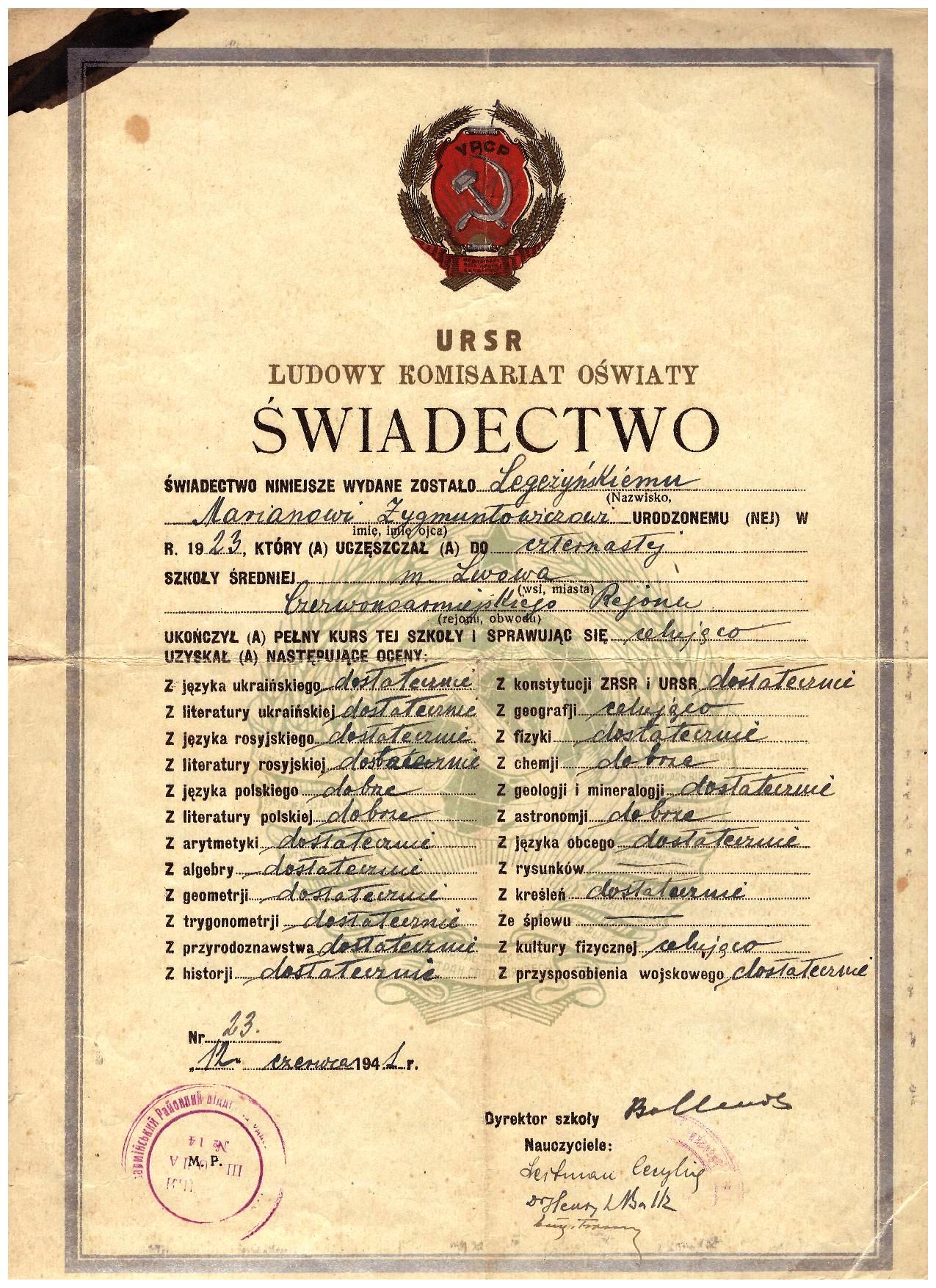 - swiadectwo-ukonczenia-szkoly-sredniej-lwow-1941-r-po-ukrainsku-marian-legezynski