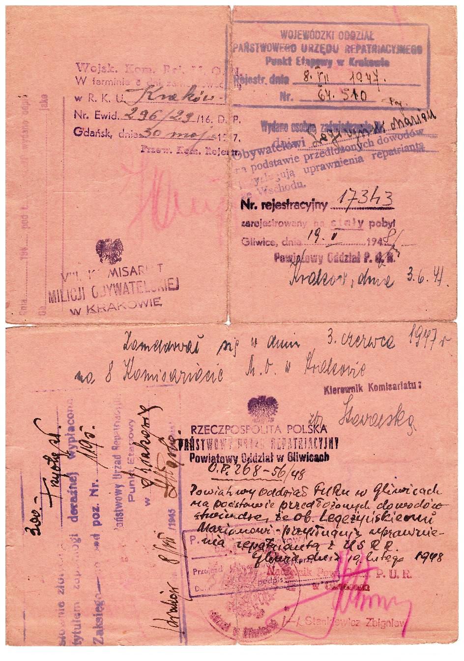 - urzad-repatriacji-gdansk-port-1947-r-zaswiadczenie-powrotu-marian-legezynski-poswiadzenia-przybycia-do-krakowa-i-gliwic