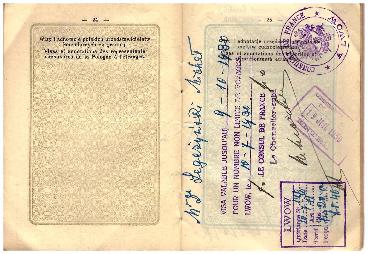 - dowód osobisty – paszport RP 1930 r str 24-25 wiza francuska Michał Legeżyński
