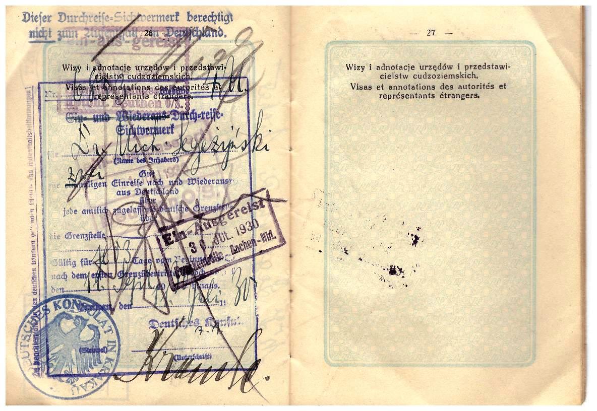 - dowód osobisty – paszport RP 1930 r str 26-27 wiza niemiecka Michał Legeżyński