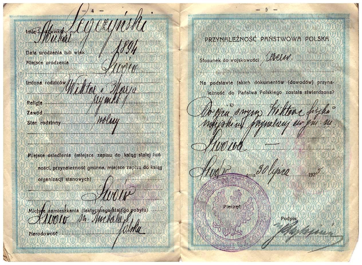- dowód osobisty RP 1925 r Lwów str 4-5 przynależność państwowa Michał Legeżyński
