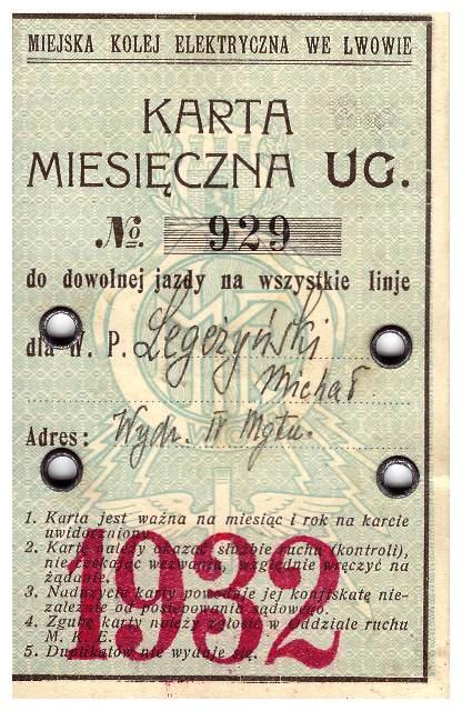- karta tramwajowa Lwów 1932 awers Michał Legeżyński