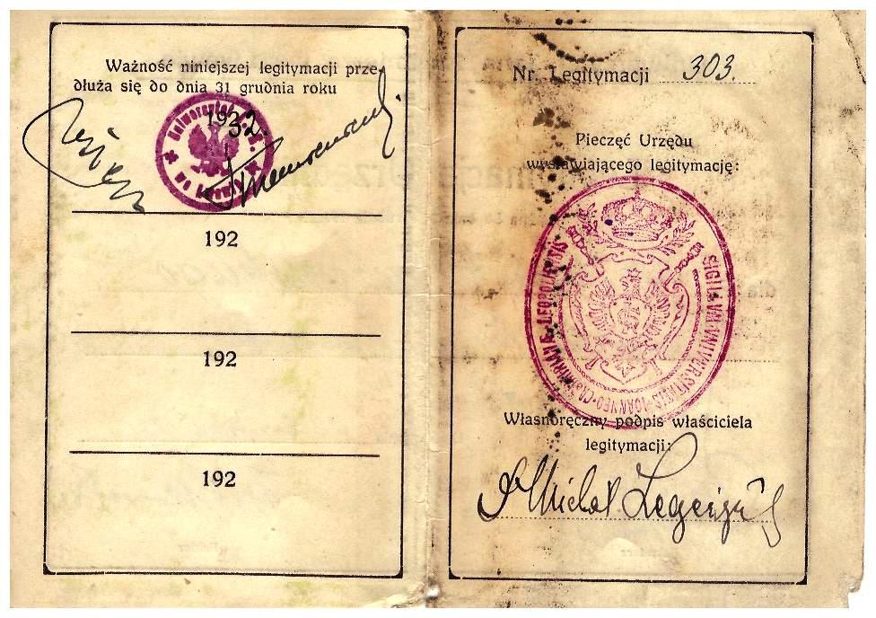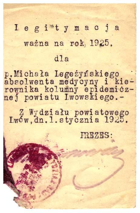 - legitymacja 1925 kierownika kolumny epidemiologicznej powiatu Lwowskiego Michał Legeżyński