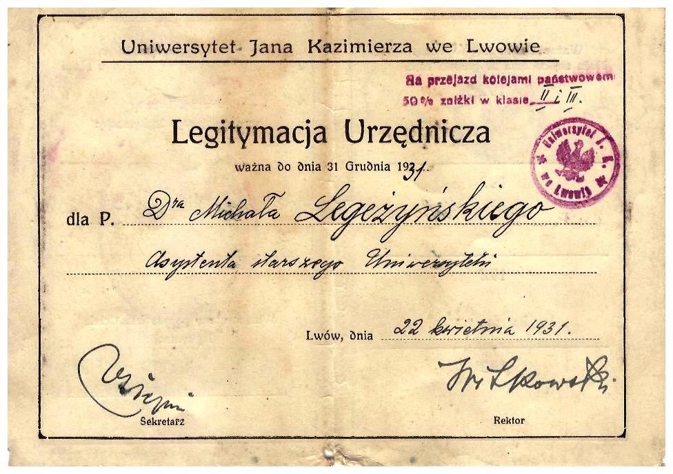 - Legitymacja Urzędnicza 1931 r Uniwersytet Lwów str 1-2 Michał Legeżyński