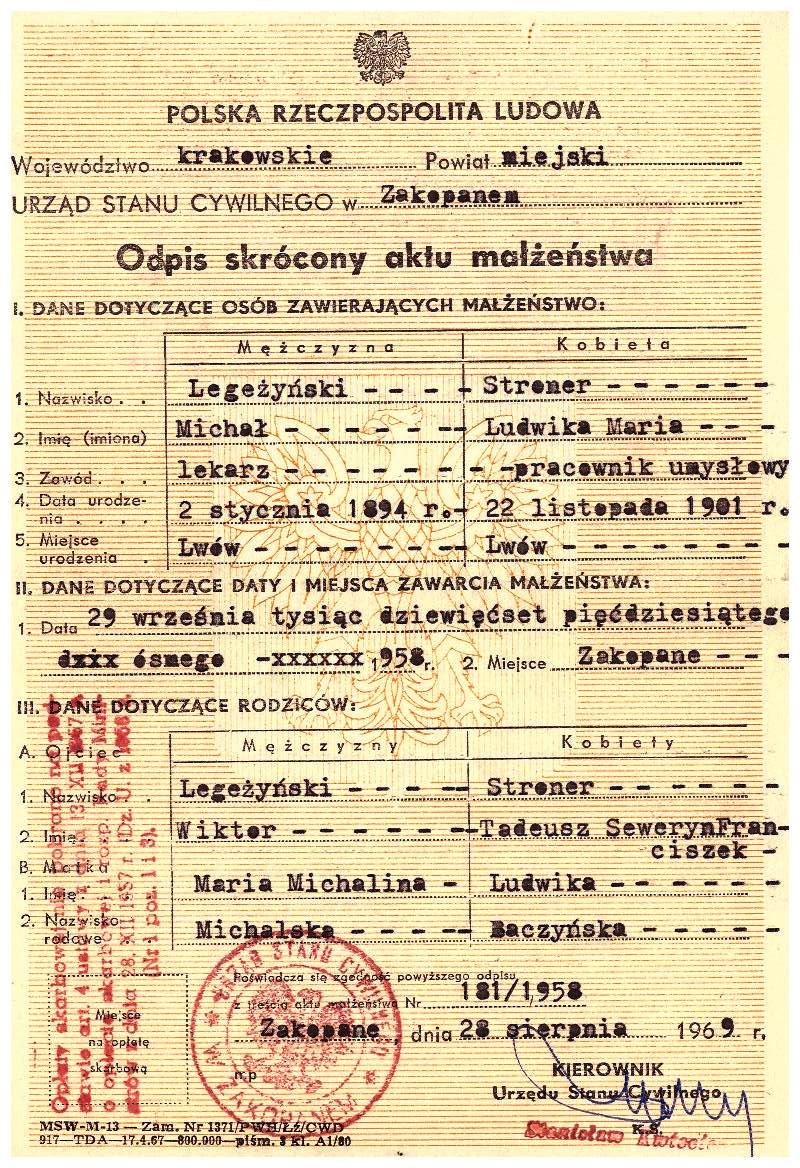 - akt małżeństwa 1958 r Ludwika Stroner i Michał Legeżyński