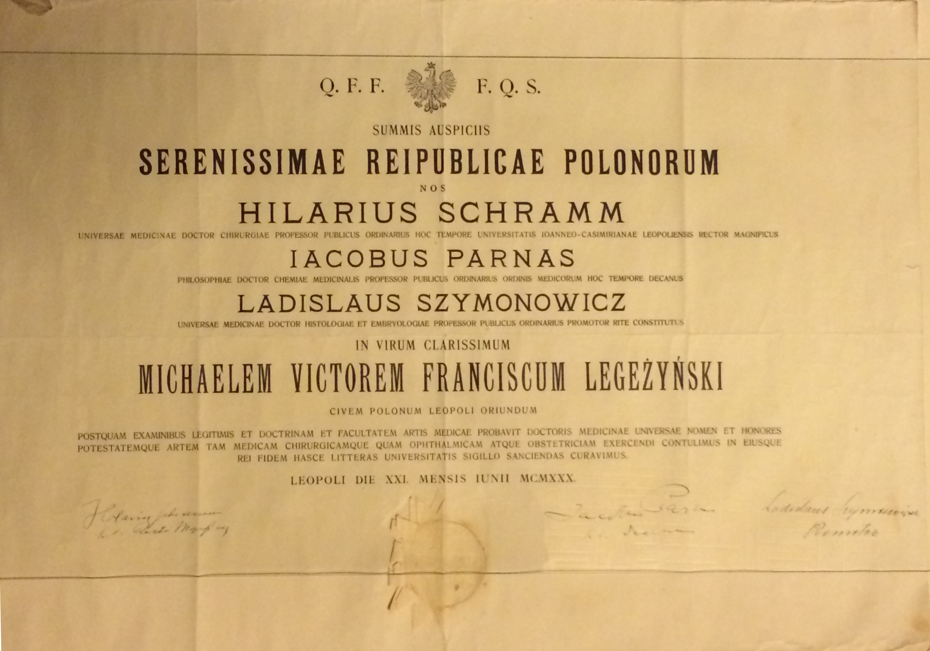- Michał Legeżyński 1930 dyplom doktora medycyny Lwów Uniwersytet Jan Kazimierza oryginał