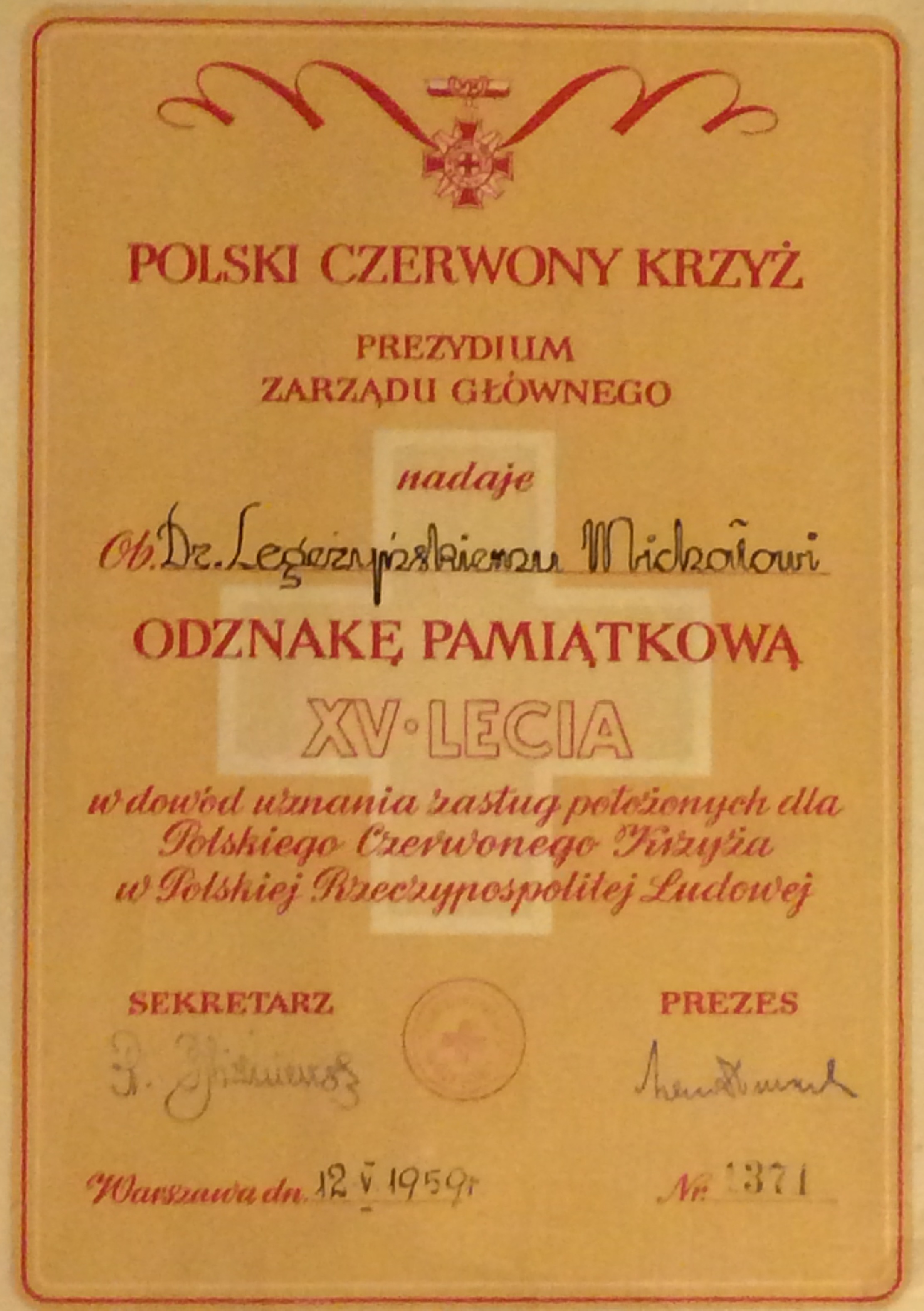 - Michał Legeżyński 1959 dyplom nadania Odznaki Pamiątkowej XVlecia PCK oryginał