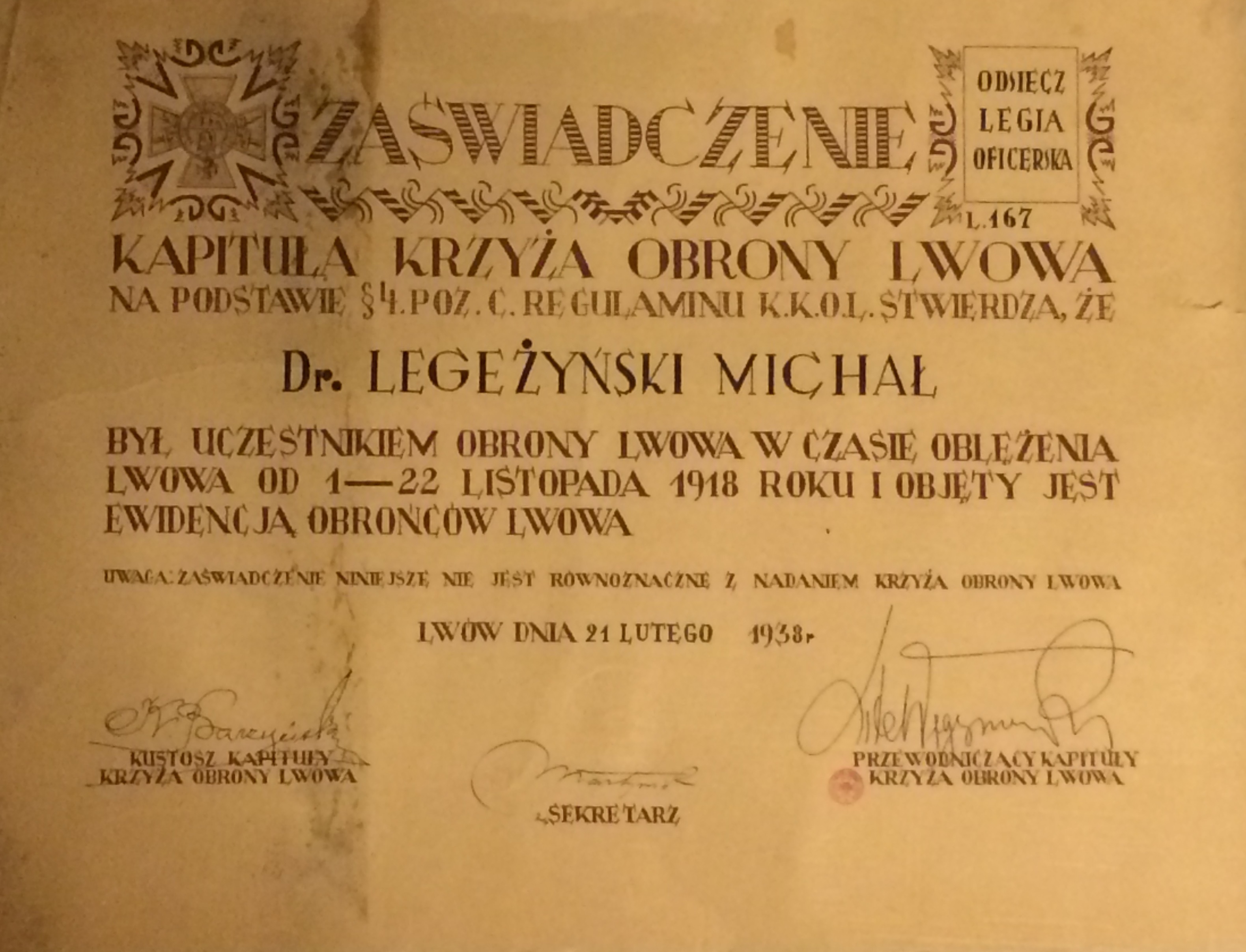 - Michał Legeżyński Lwów 1938 zaświadczenie uczestnika Obrony Lwowa
