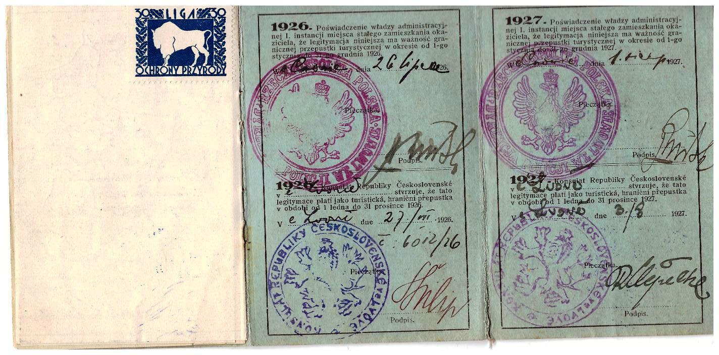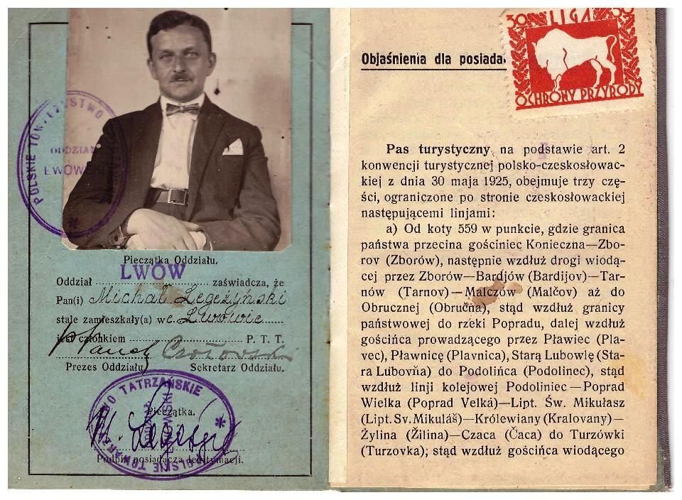 - Polskie Towarzystwo Tatrzańskie legitymacja 1926 r potwierdzenie Policji we Lwowie i Konsulatu CSR we Lwowie Michał Legeżyński