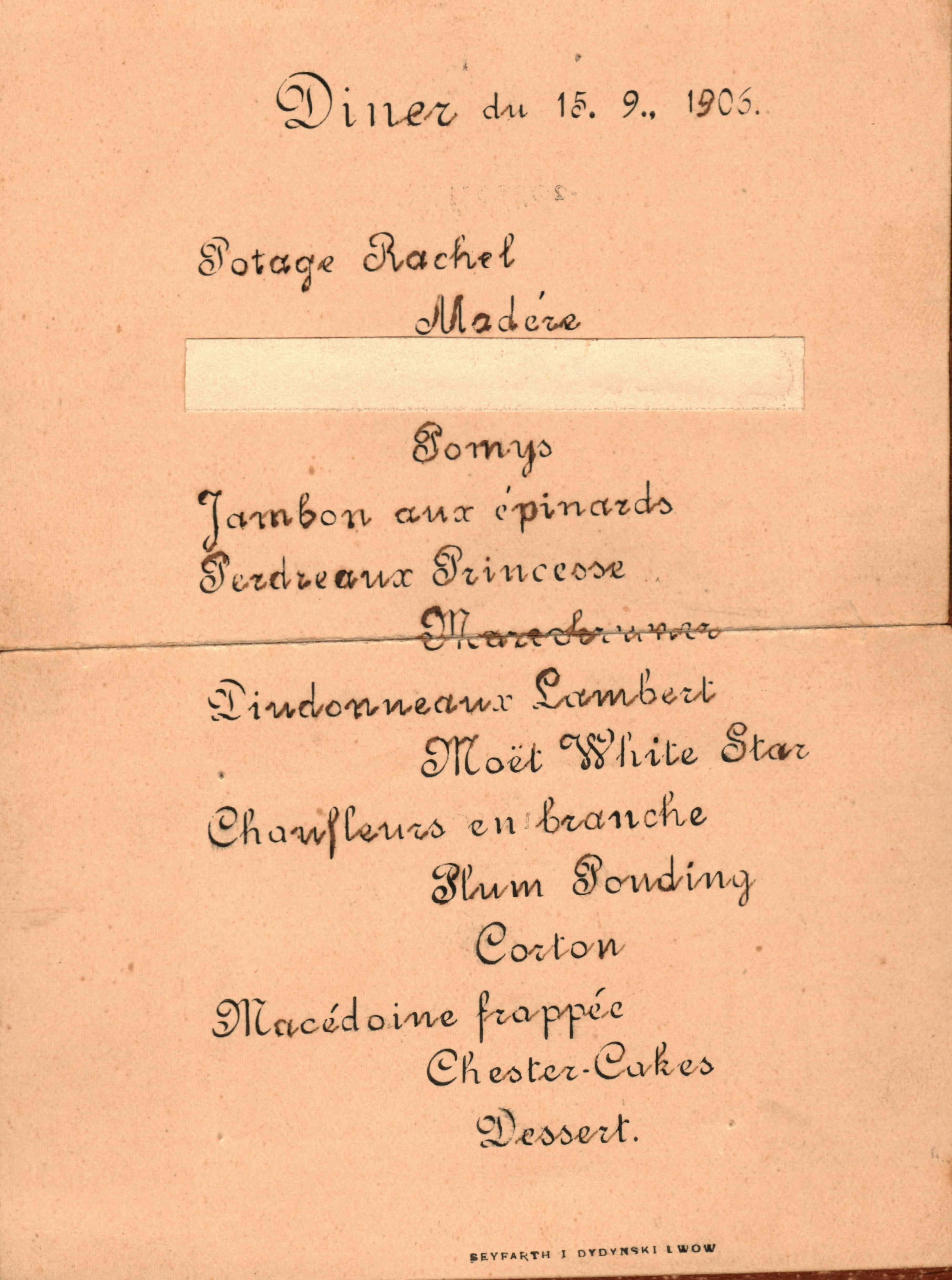 – zaproszenie na okolicznościowy obiad w 1906 r, z planowanym menu: