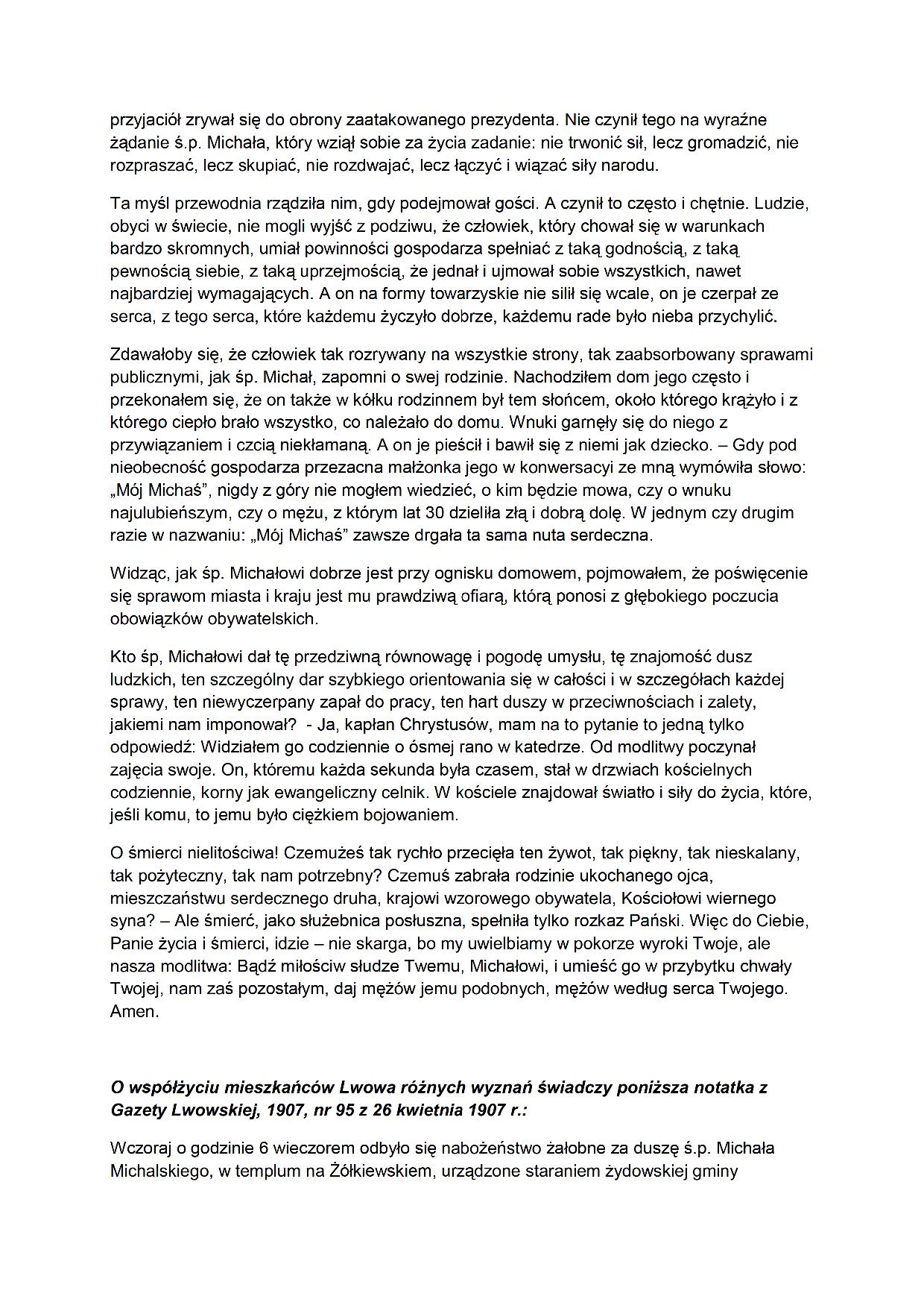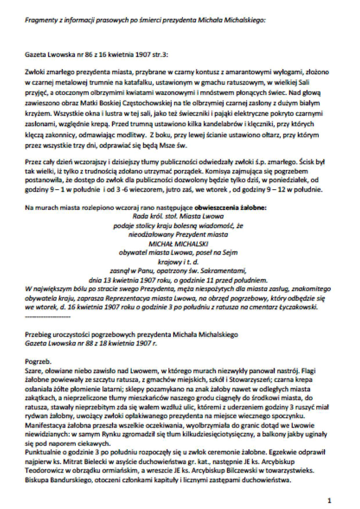 Uroczystości pogrzebowe śp. Michała Michalskiego, Prezydenta Miasta Lwowa, zmarłego nagle w 1907 r, w trakcie pełnienia urzędu, dokumentują zwyczaje i zachowania, składających się na obraz życia i organizacji społeczeństwa mieszczańskiego Galicji początku XX wieku. Uroczystości pogrzebowe Prezydenta m. Lwowa zorganizowane zostały przez władze miasta i przerodziły się w wielotysięczny hołd mieszkańców Lwowa dla swojego wybitnego Obywatela, wielce zasłużonego dla rozwoju miasta Lwowa. Zmarły pochowany został na cmentarzu Łyczakowskim we Lwowie, jego nagrobek ufundowany został przez Radę Miasta. Przechowywana w Rodzinie ozdobna księga z setkami adresowanych do wdowy oryginalnych telegramów kondolencyjnych, listów i wizytówek – jest dowodem powszechnego szacunku dla dokonań Michała Michalskiego i jego wkładu w życie i rozwój Lwowa.