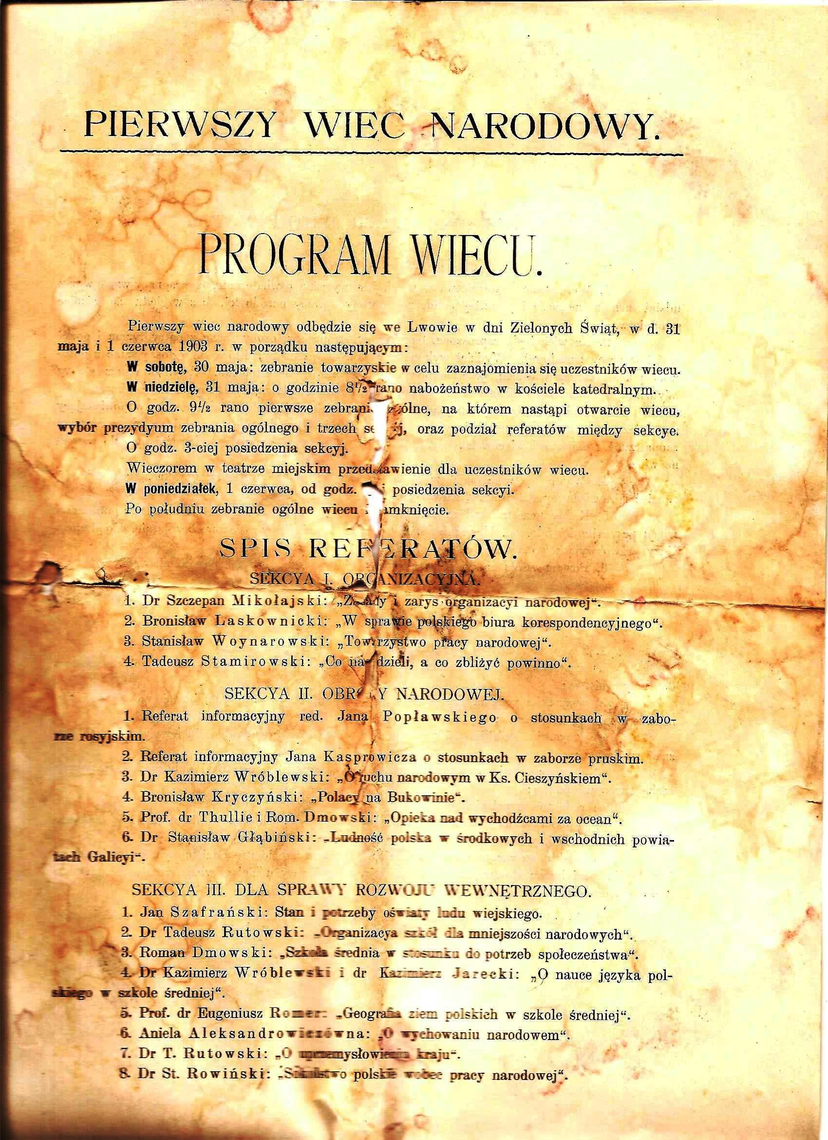 Pierwszy wiec narodowy organizowano w dn 31 maja i 01 czerwca 1903 r we Lwowie. Przesłanie wiecu określono następująco: „warunkiem uczestnictwa w wiecu jest wyraźne oświadczenie, iż pragnący wziąć w nim udział uznaje możliwość i potrzebę solidarnej obrony i pracy narodowej, bez względu na różnice stronnictw”.