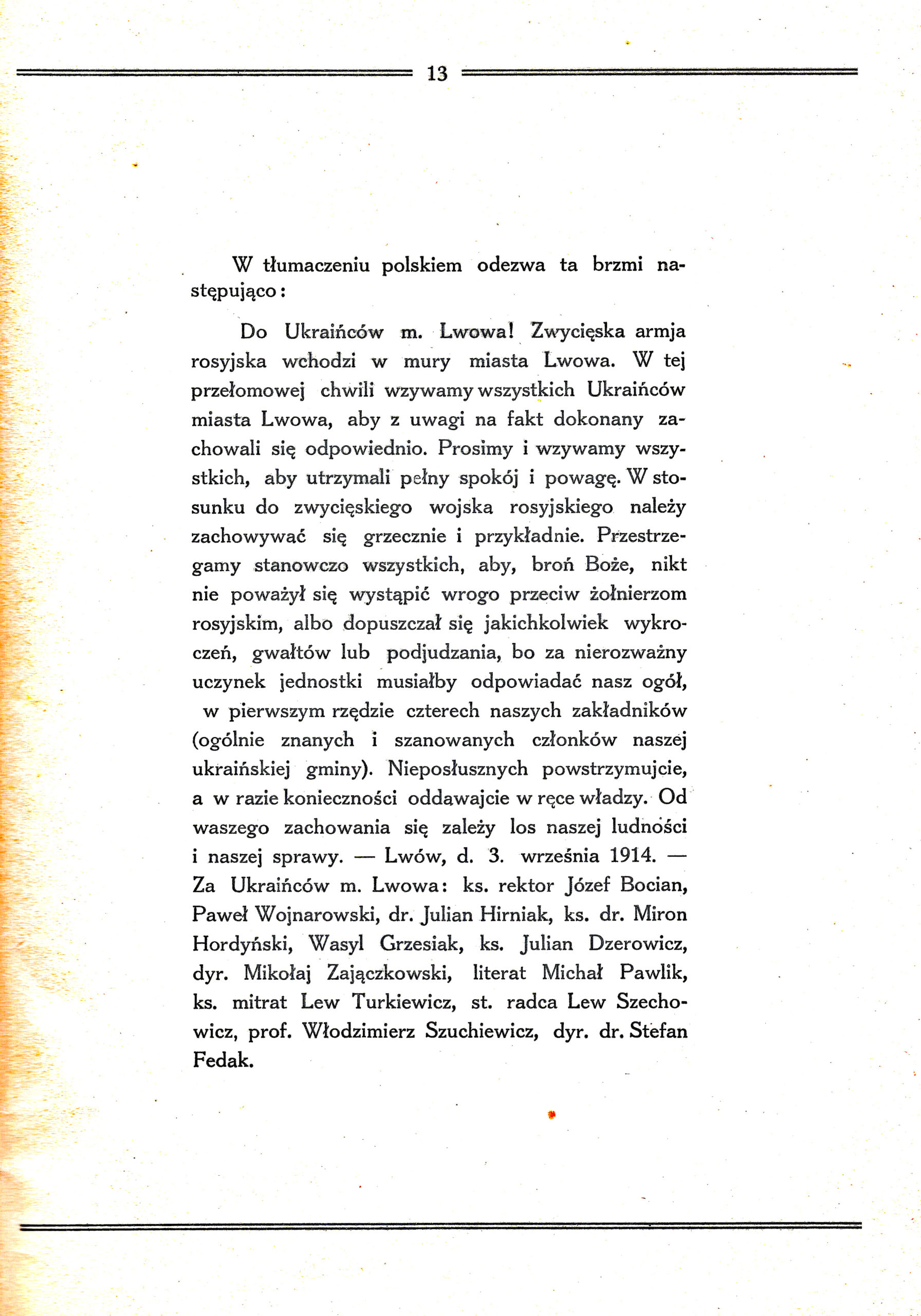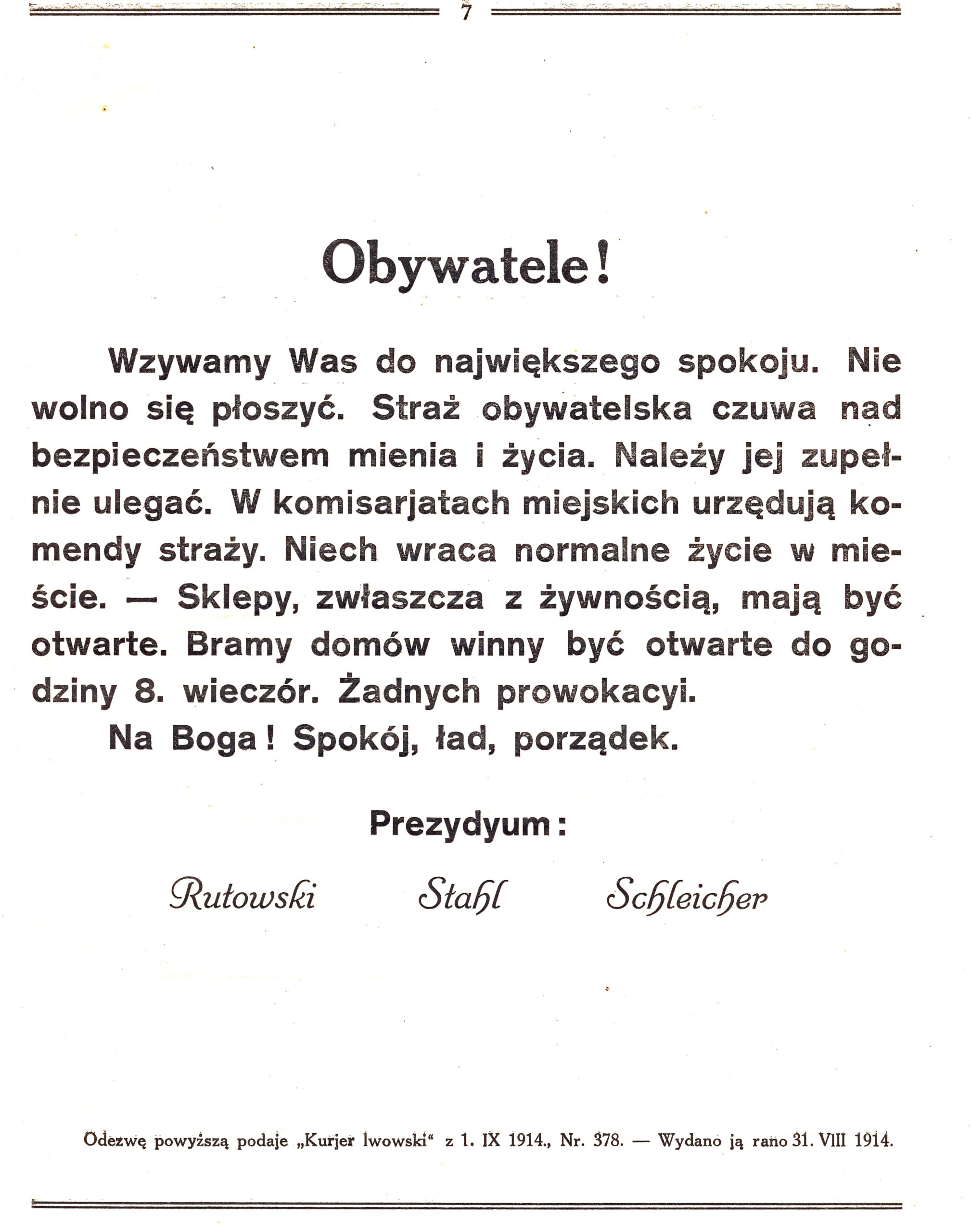 rzadko się o tym wspomina, ale Lwów pierwszą okupację rosyjską doświadczył na początku I-ej wojny światowej. Na początku wojny, jesienią 1914 roku armia rosyjska przełamała wojska austriackie i zajęła spory teren Galicji, w tym Lwów. Po odwrocie Austriaków do miasta wkroczyła armia rosyjska, wtedy jeszcze Rosji carskiej. Rozpoczęła się okupacja trwająca od 04 września 1914r do 22 czerwca1915r. Jak okiem mieszkańców, wyglądała rzeczywistość rosyjskiej okupacji Lwowa sto lat temu – pokazują przechowywane w Rodzinie dokumenty: