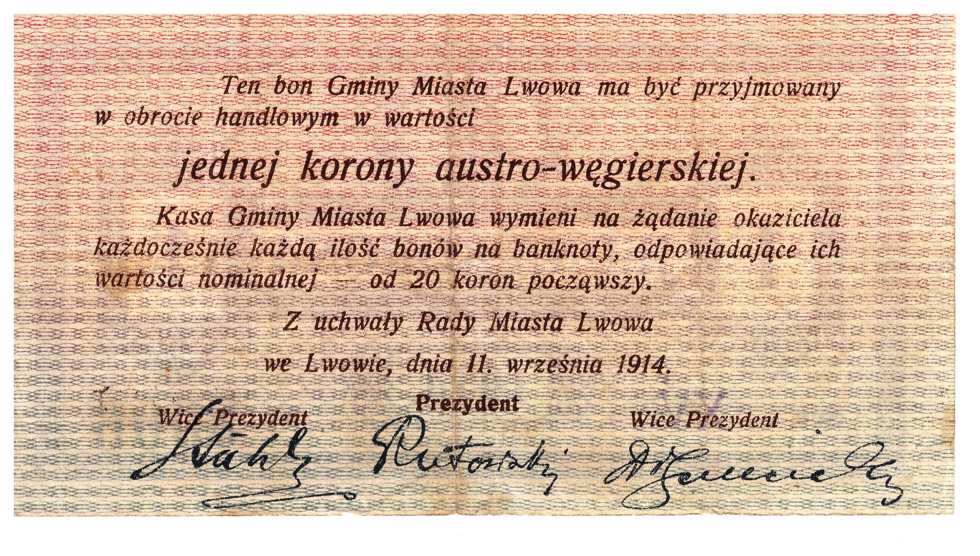- 1914 bon gminy m. Lwowa na jedną koronę austr-węgierską awers