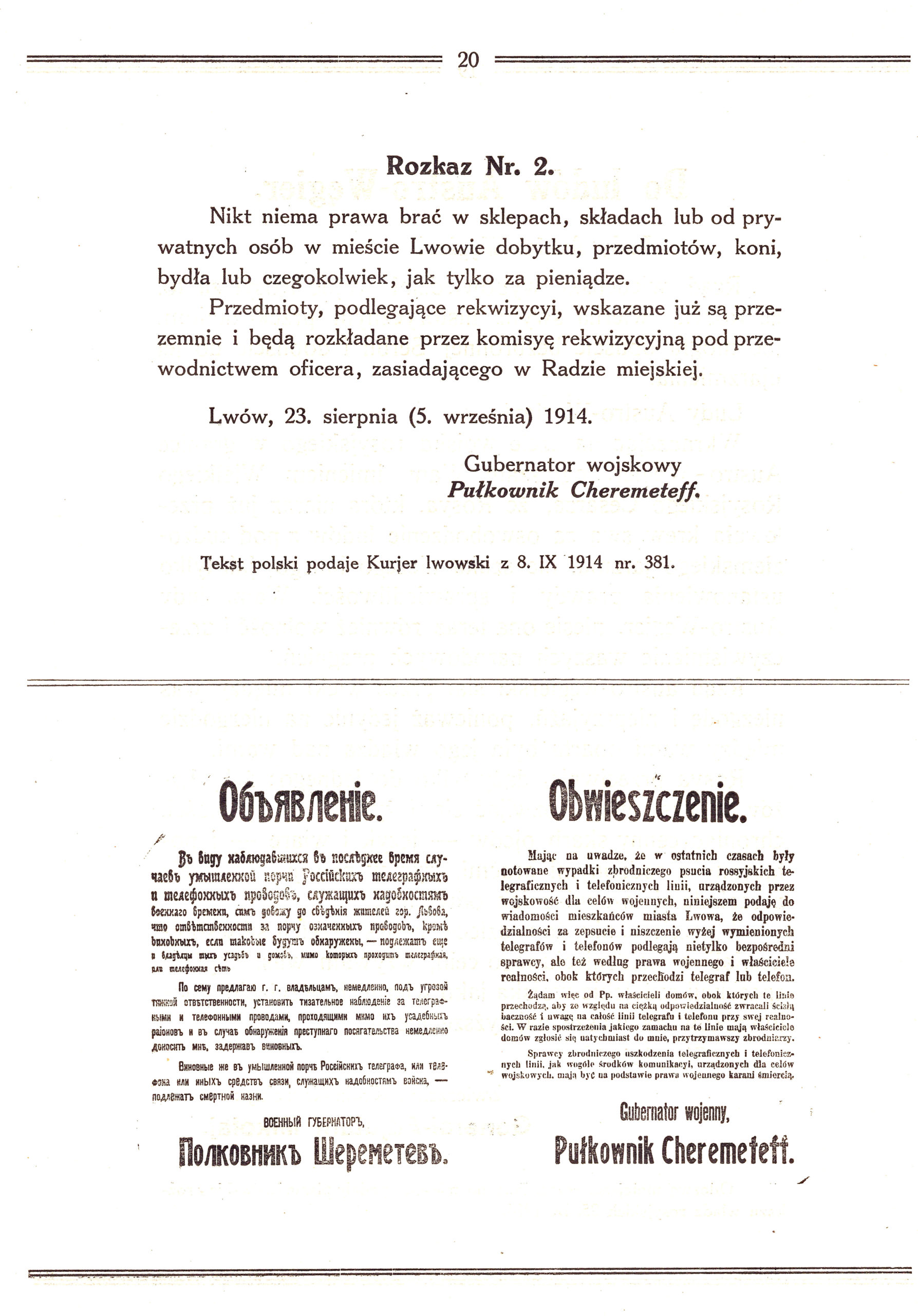 - rosyjska okupacja Lwowa 1914-15 rozporządzenia 20a