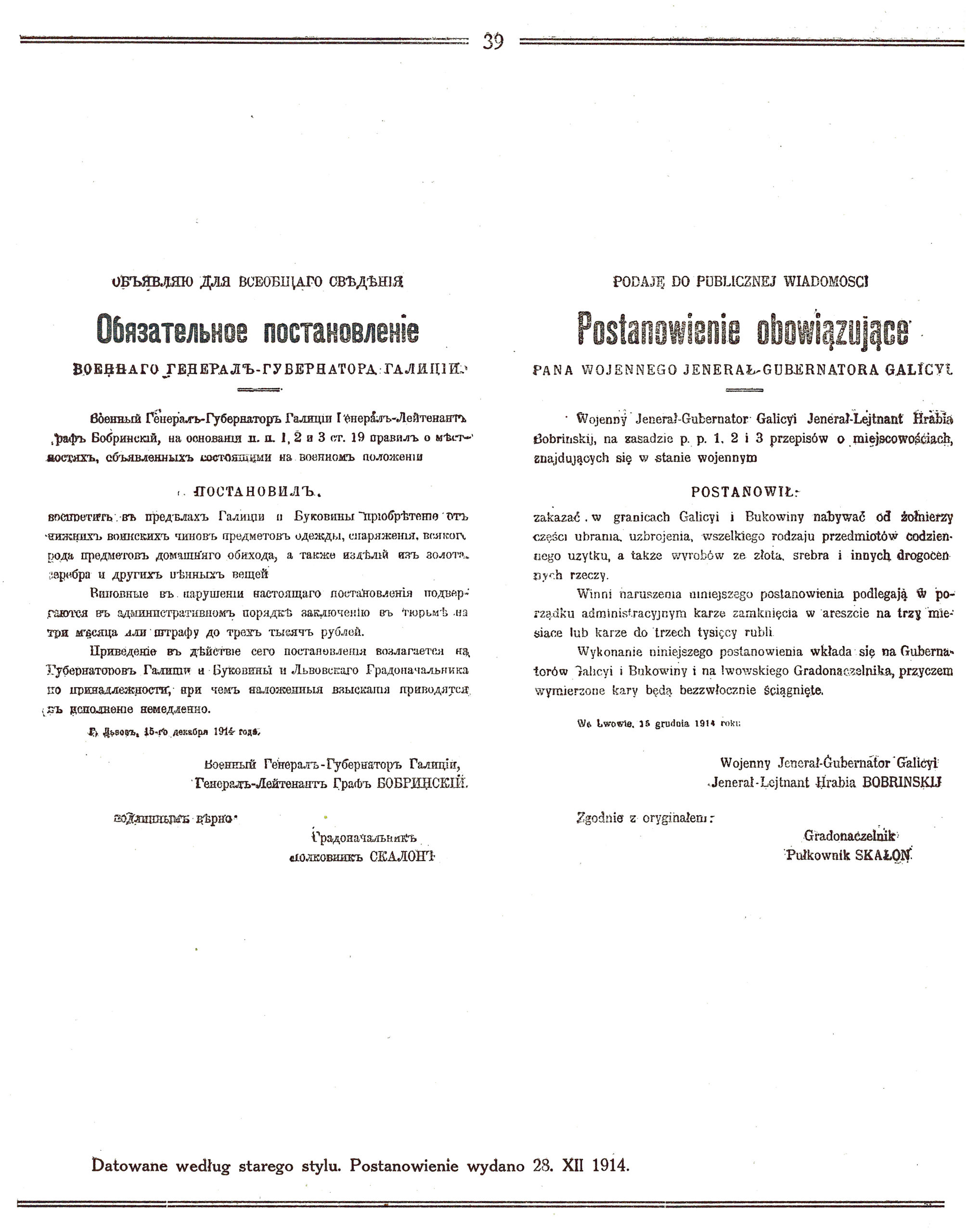 - rosyjska okupacja Lwowa 1914-15 rozporządzenia 39
