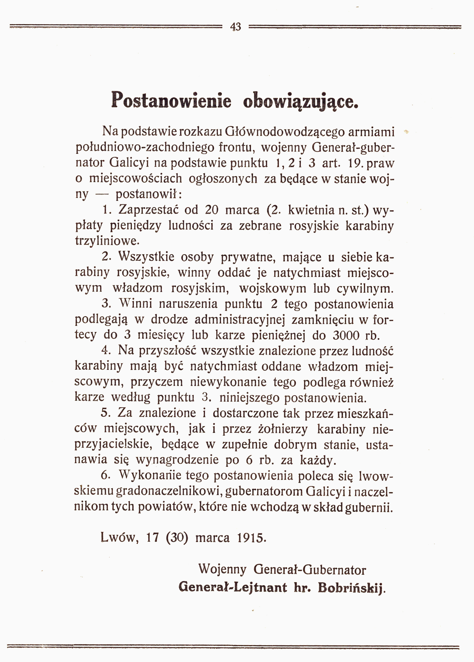 - rosyjska okupacja Lwowa 1914-15 rozporządzenia 43