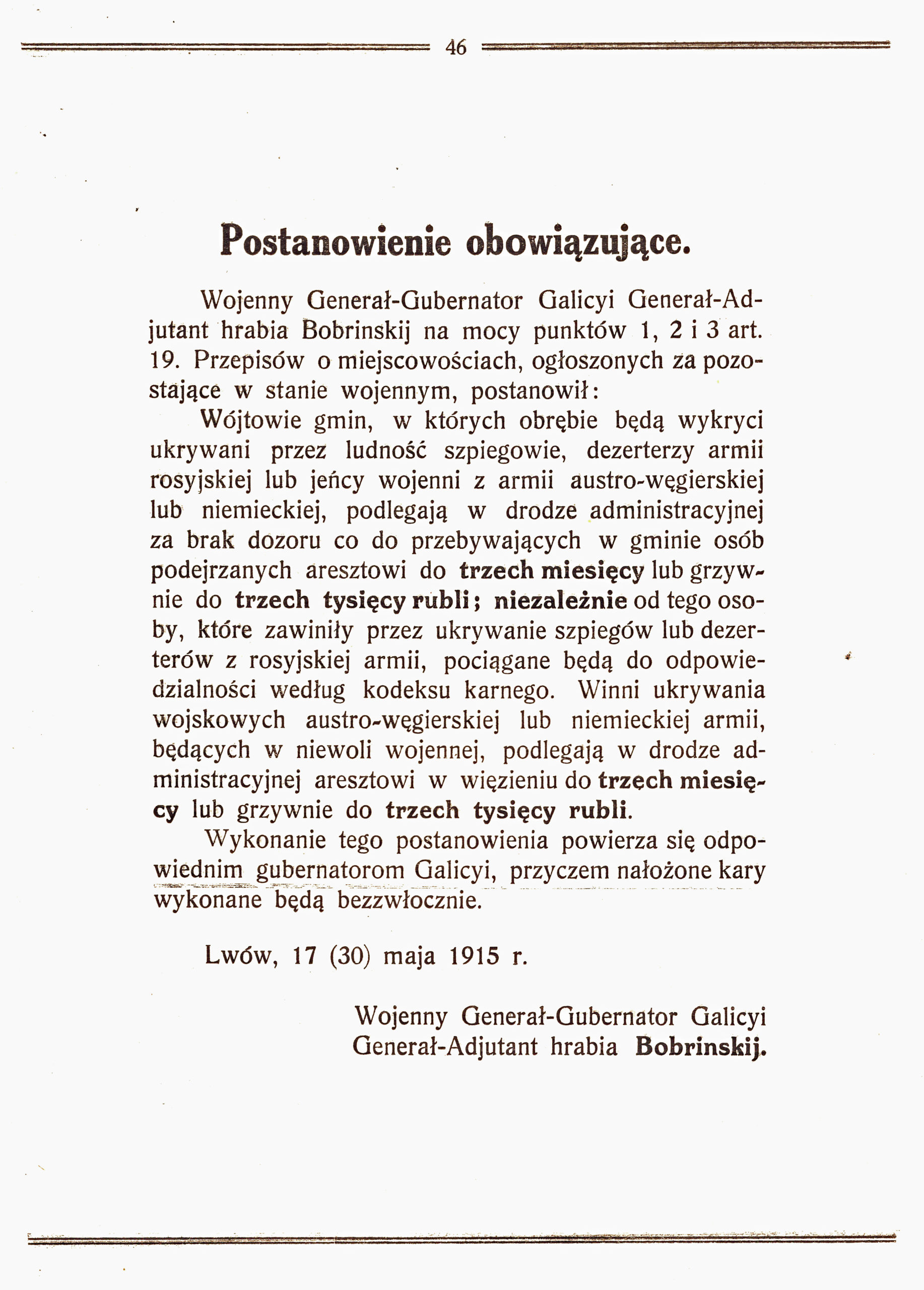 - rosyjska okupacja Lwowa 1914-15 rozporządzenia 46