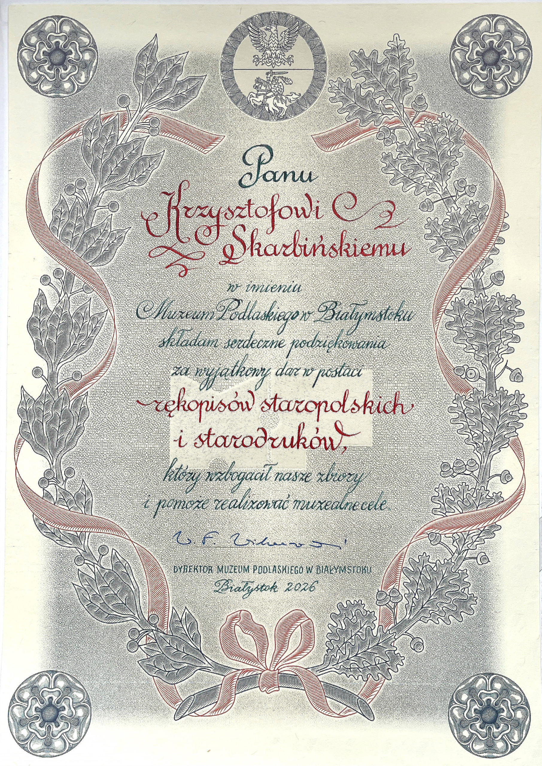 - dyplom podziękowanie dla Krzysztofa Skarbińskiego za darowizny starodruków dla Muzeum Podlaskiego Białystok 29Jan26