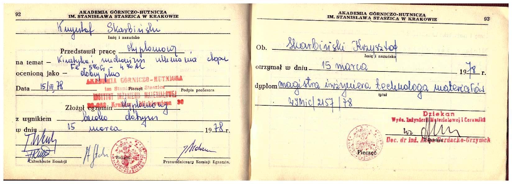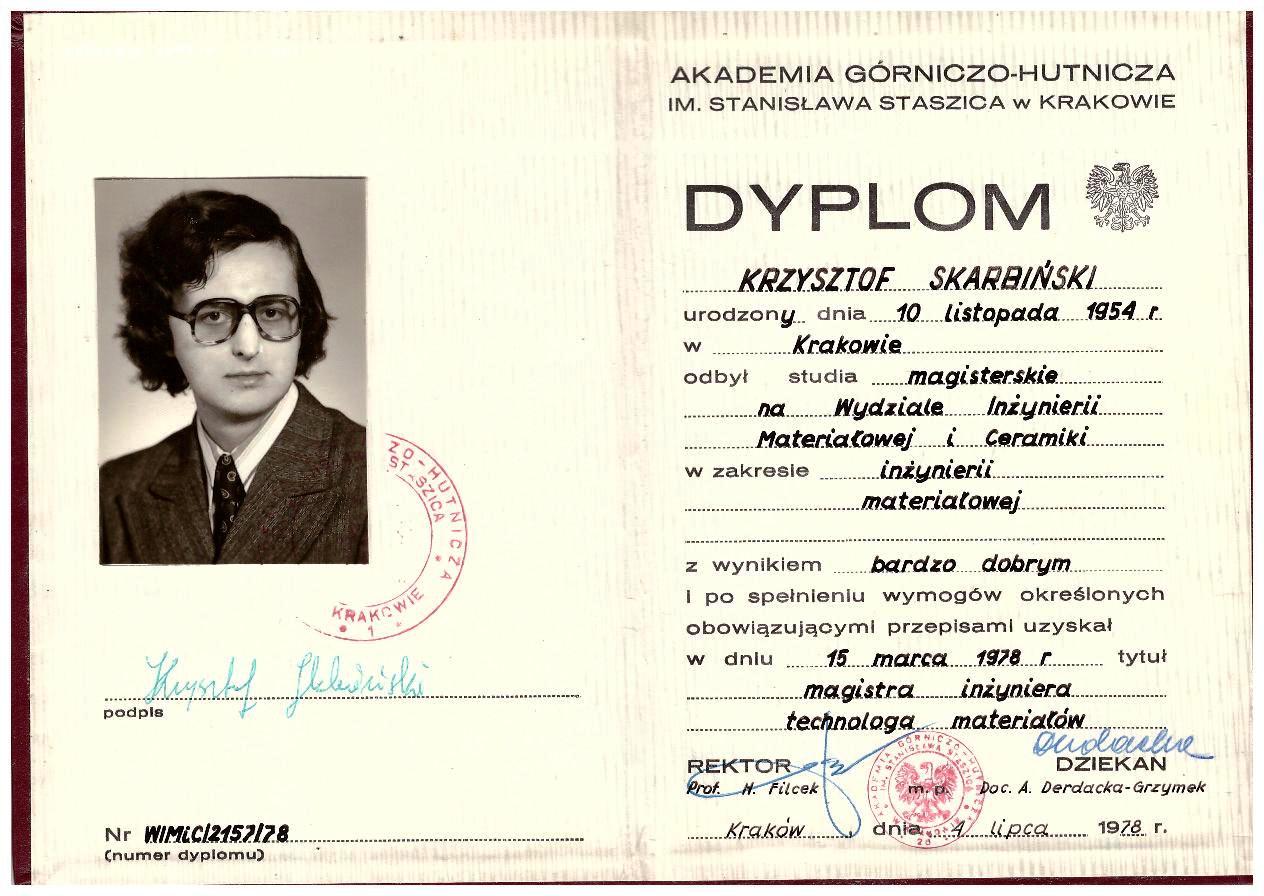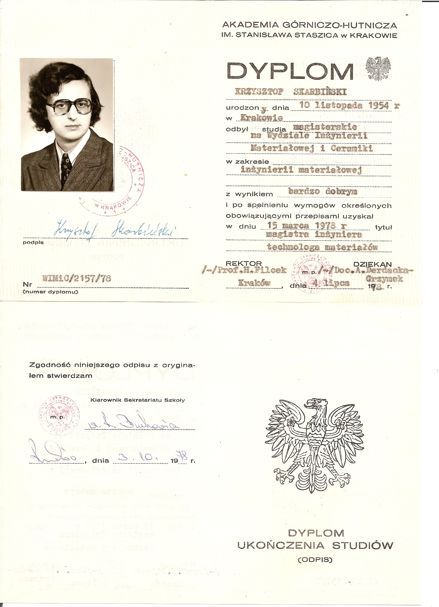 - dyplom ukończenie studiów Inżynieria Materiałowa na Wydz Inż Mat i Ceramiki AGH 1978 r