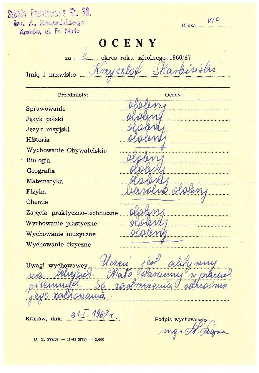 - arkusz ocen II-gi okres klasa VIc Szkoła Podstaw nr 38 w Krakowie ul. Nullo styczeń 1967 r