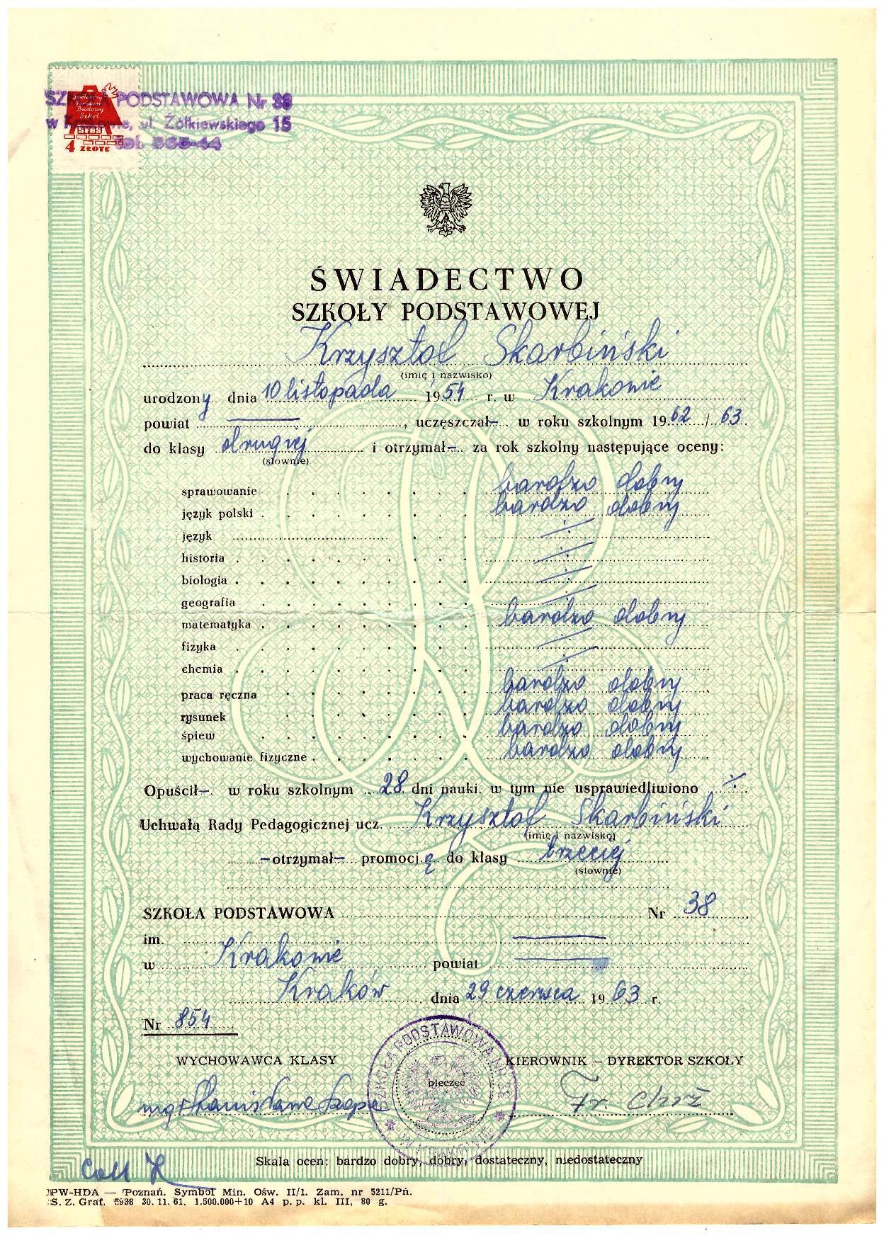 - świadectwo ukończenia II-ej klasy Szkoły Podstawowej nr 38 w Krakowie ul. Żółkiewskiego 15 czerwiec 1963r